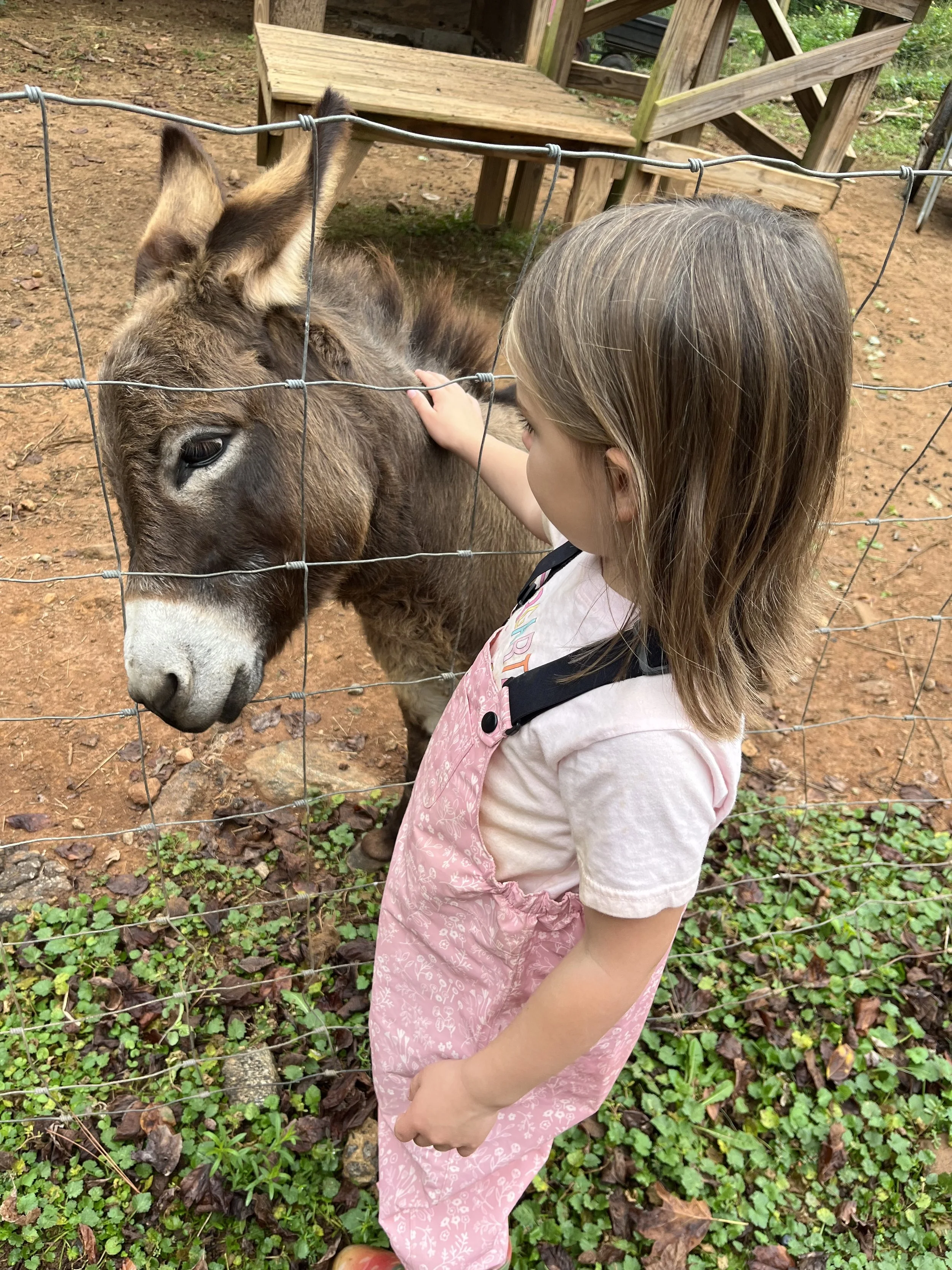 It was rainy during the week, so we visited the farm on Tuesday, instead of the creek. The children were thrilled to spend time with the donkeys, goats, and chickens! On our walk to the farm, we collected kudzu and had so much fun feeding it to Freida and Pacem (the donkeys) and Marshmallow and Caramel (the goats).