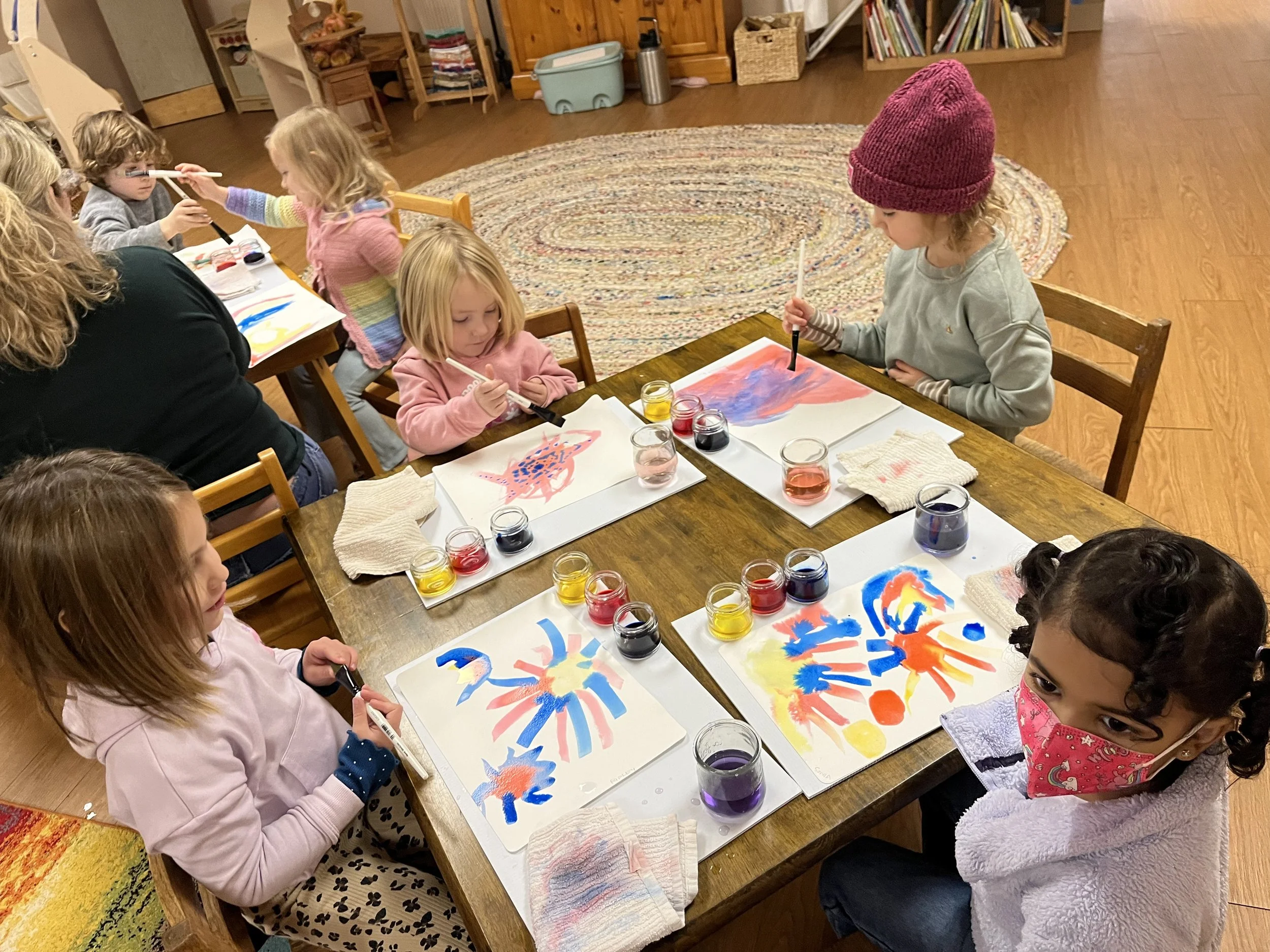 Another highlight of our week was painting with three colors for the first time this year. As soon as we entered the room, the children noticed the jars of red, blue, and yellow paint. Soon there were joyful exclamations as they mixed colors—creating green, orange, and purple! Our wet-on-wet watercolor painting encourages a deep understanding of color blending. During the painting session, many of the children were focused on mixing the two primary colors in varying proportions to create as many secondary and tertiary colors as possible. As they paint, the children are developing important fine motor skills—holding the brush, moving it gently across the paper, dipping it carefully into the water and paint. After each painting session, the children are responsible for cleaning up their space and materials before going off to play. This simple, important routine builds self-care, independence, and a wonderful sense of will.