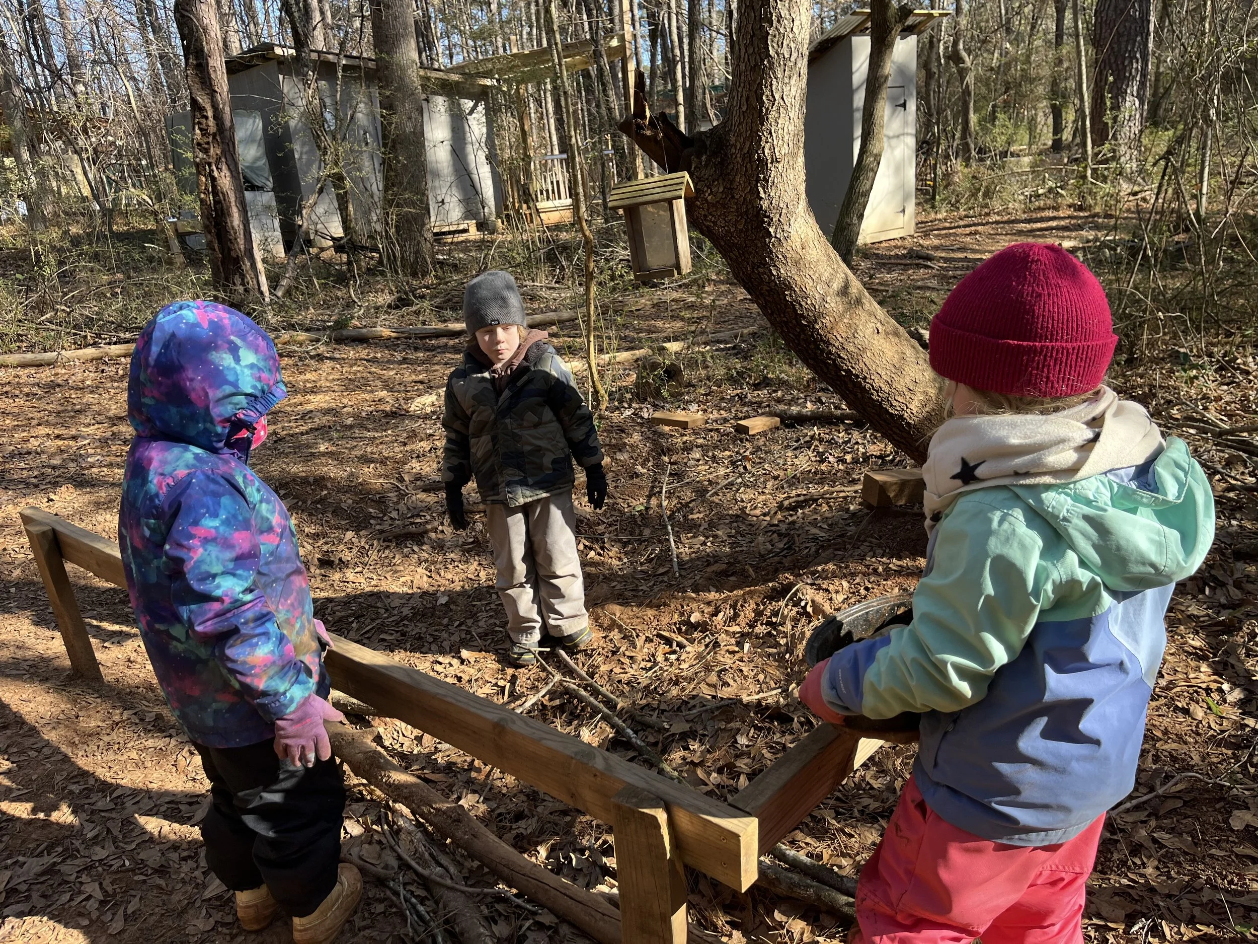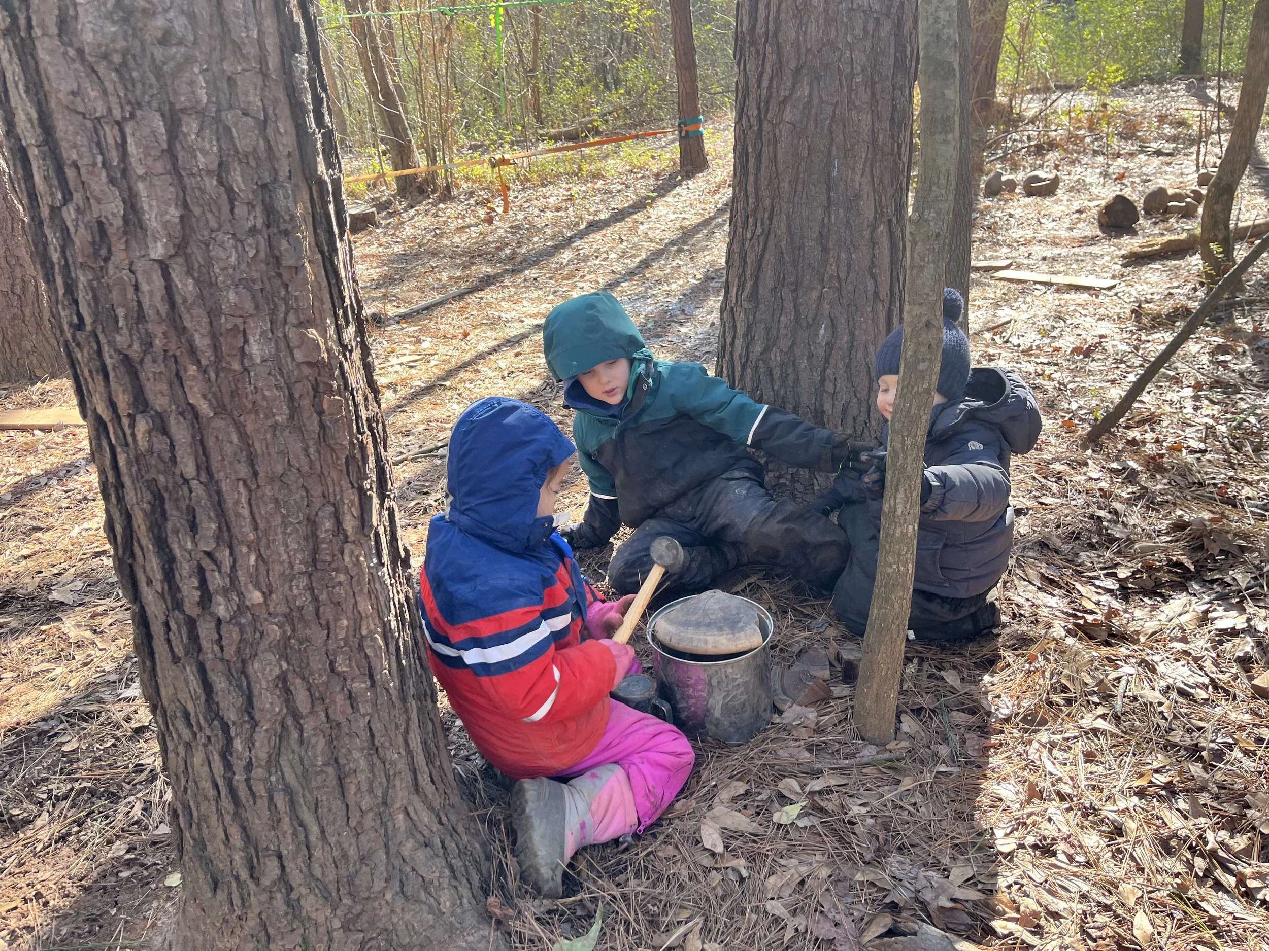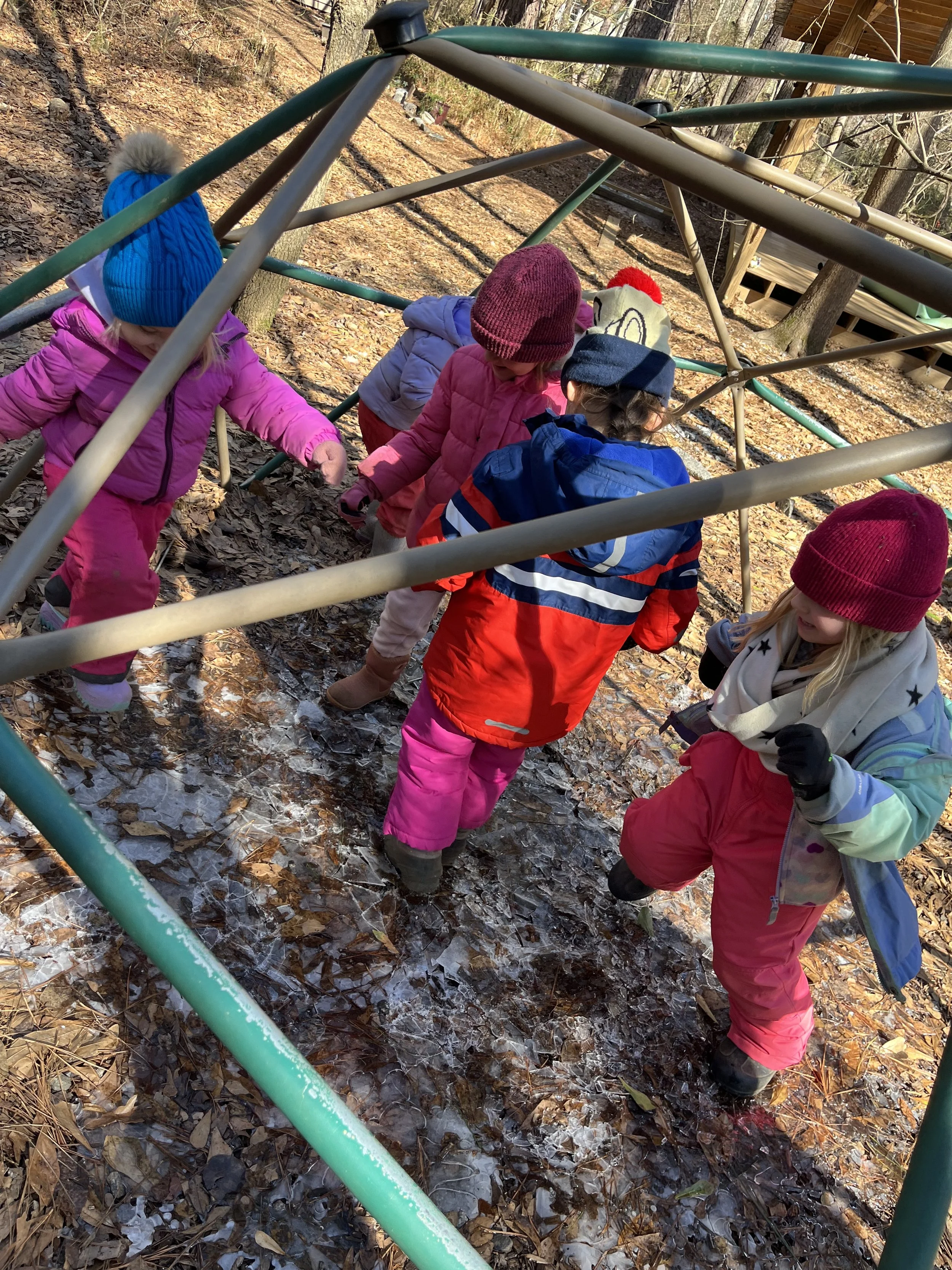 Early in the week, ice was everywhere in our forest class! The children had fun sliding on it, breaking it, collecting it, and incorporating it into their imaginative play. They spent hours trying to extract chunks of ice from mud kitchen toys, shaving it with hand shovels and scoops to “make snow”, and creating elaborate mud kitchen recipes.