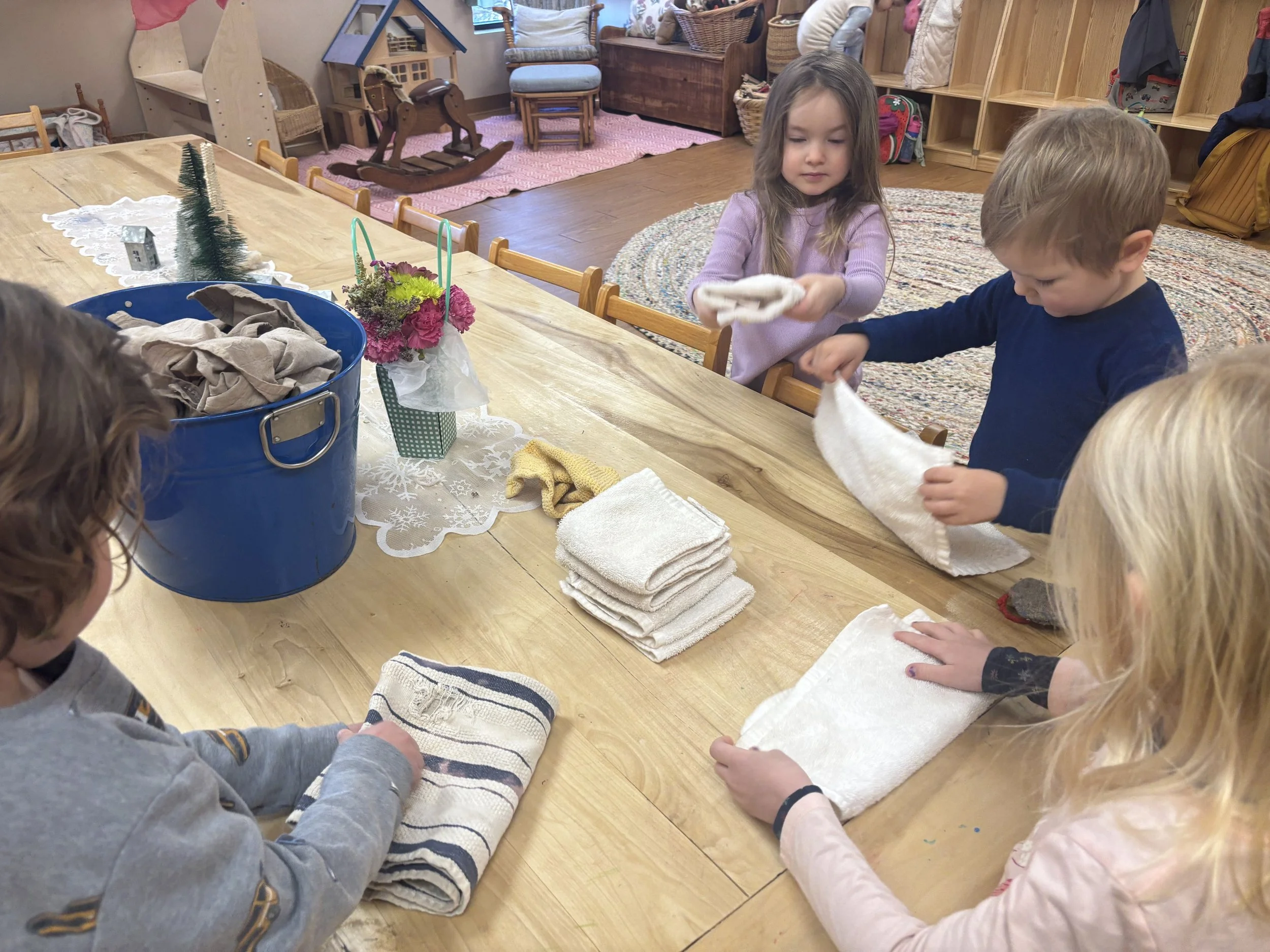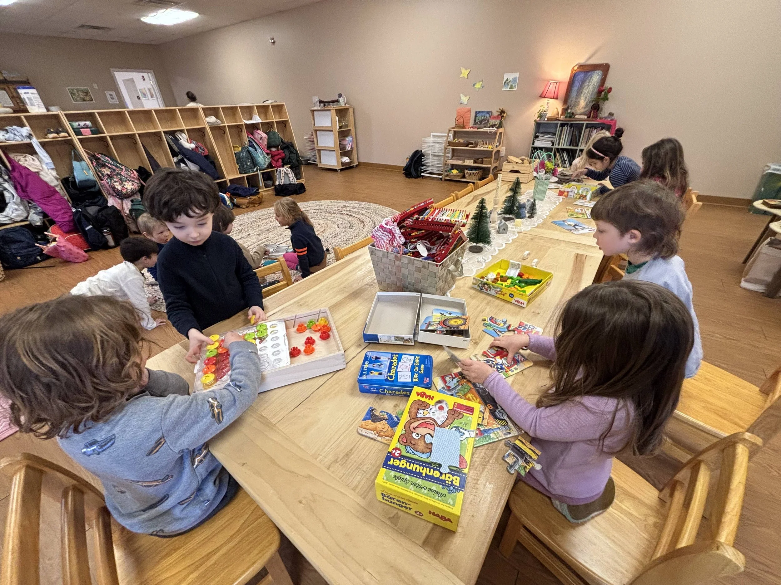 It was another chilly week, which found us indoors most mornings. One of our classroom parents generously gifted us several beautiful games from Germany, and the children delighted in them, spending nearly every morning absorbed in play. The students explored animal stacking games, color-matching and shape-formation games, and the most popular of all- a marketplace game. In this game, children choose a shopping list and are given various forms of coins and cash to purchase grocery items. It’s a wonderful matching game that supports observation skills, problem-solving, and imaginative play.