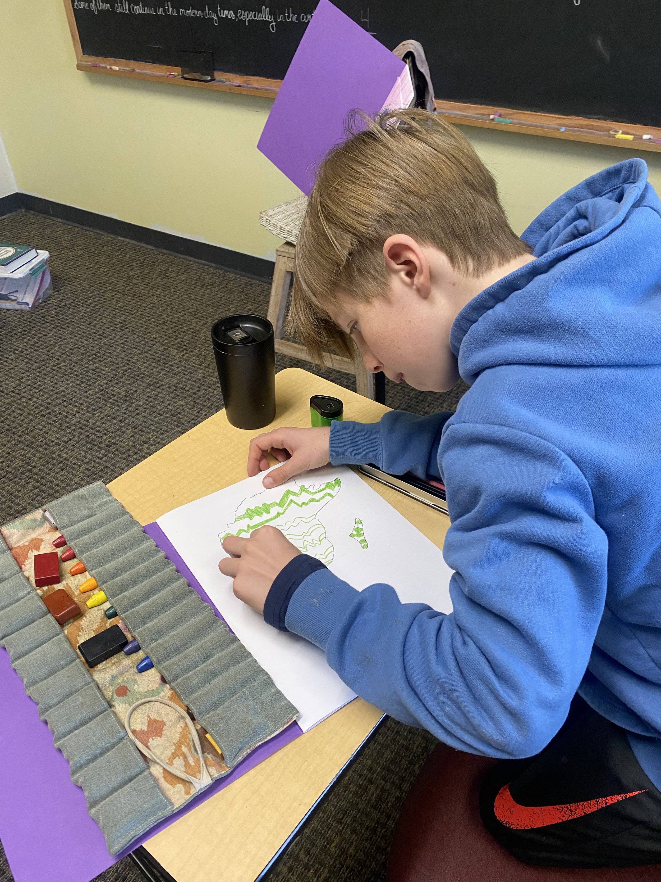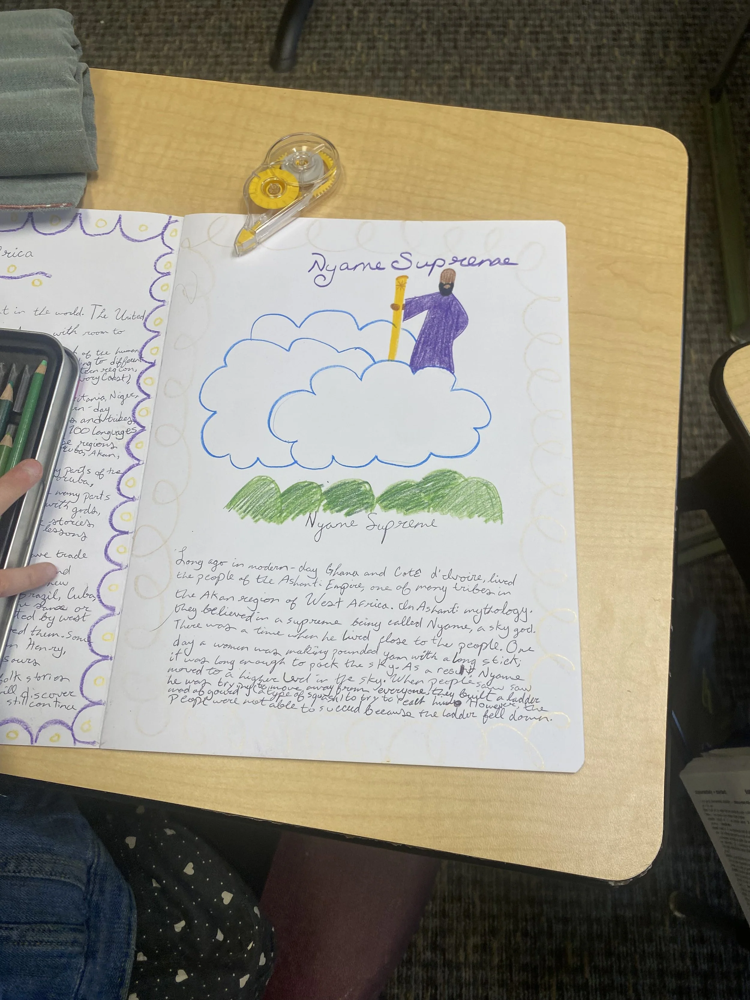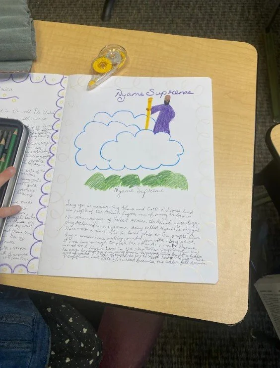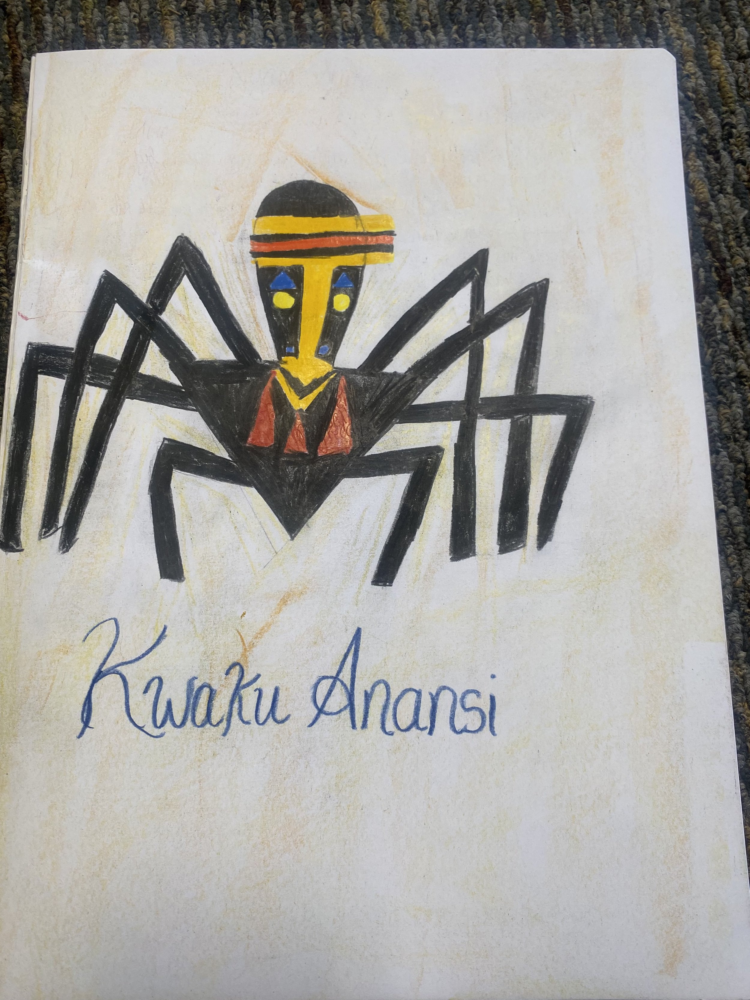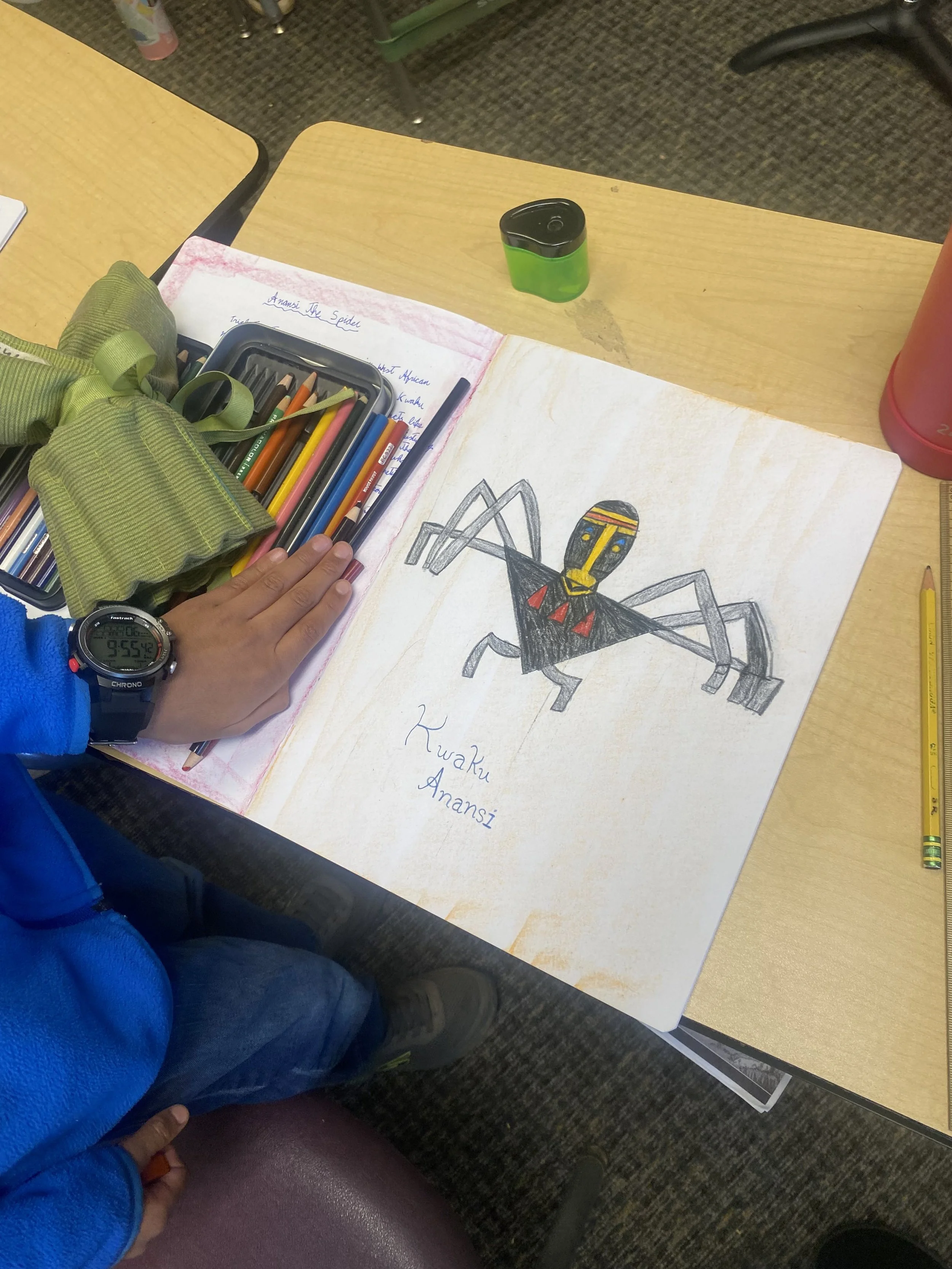 This week, the class began their seventh Main Lesson block: West African Mythology. First, we began with a generic overview of the West African region, highlighting the modern-day nations as well as the major tribes and ancient civilizations where all of the mythology stories they will learn about were born. On the following day, we talked about our first region: The Ashanti kingdom of the Akan region (modern-day Ghana and Ivory Coast). We primarily focused on the stories of the sky god Nyame, and the infamous trickster spider Anansi, the one who managed to even outsmart the supreme being. The class started their class reader, Tristan Strong Punches A Hole In The Sky by Kwame Mbali. This book is based on Ashanti mythology as well as African diasporic folk characters such as Brer Rabbit, Brer Fox, Gum Baby, and John Henry, many of whom were inspired by Ashanti mythology. In this fictional series, the reader goes on an adventure with Tristan after he accidentally opens a portal to the world where all the folktales he heard as a young child come to life.