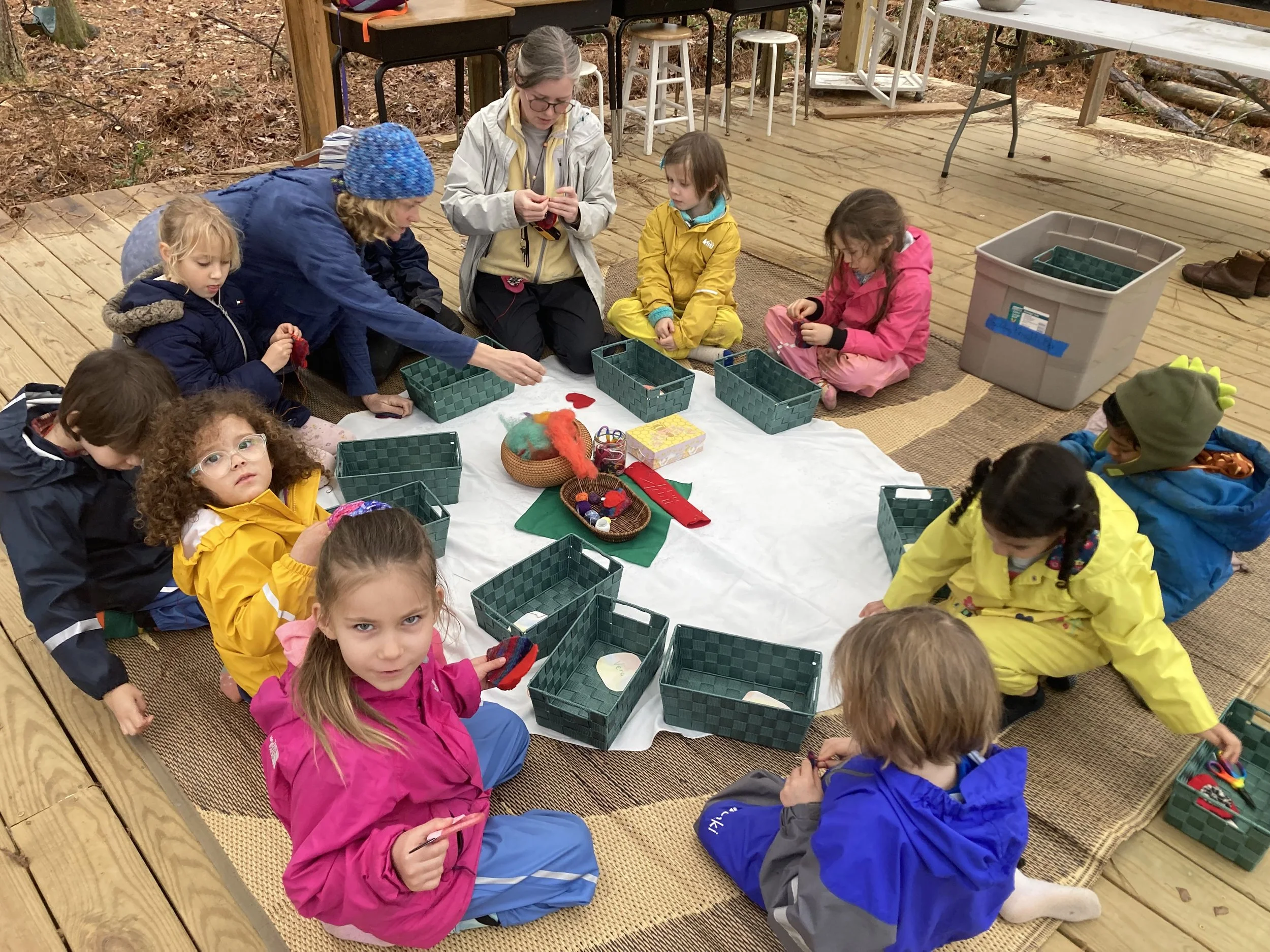 When we return from the break, the students will begin working on their portion of the Chickadee auction project. They will use green, brown, and blue felt of varying hues to create a play mat for the Garden School Play Farm. Once the mat is complete, the class will work together to wet-felt a replica of the large boulder they enjoy climbing on at the farm. Along with wet felting, the class will begin taking more nature walks. Students who are interested in more handwork and structured projects will have the opportunity to sew stuffed animals and baby dolls, while younger students will do more finger knitting before moving on to sewing.