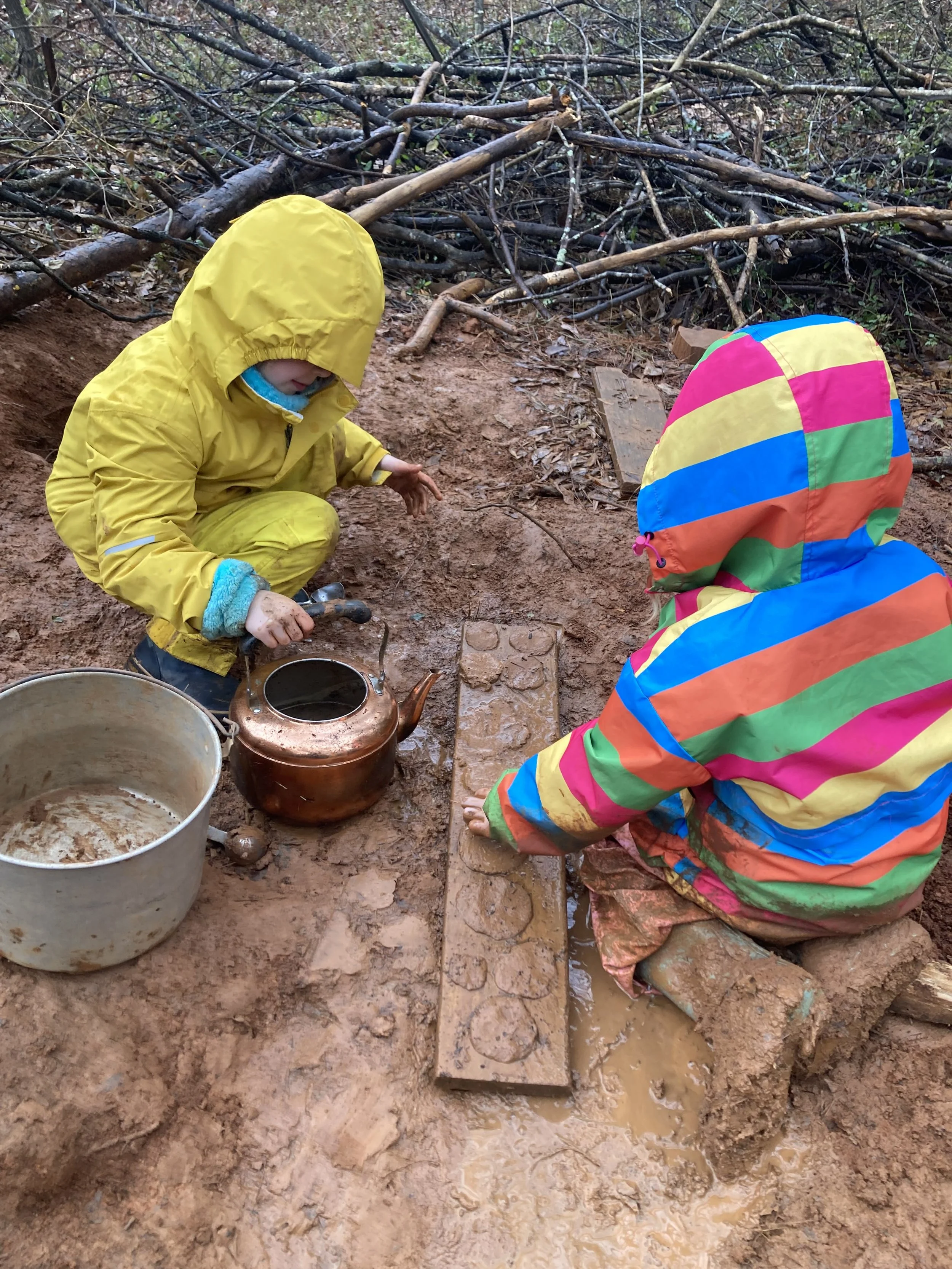The rain last Wednesday led to joyful mud play as the children created soups, pies, and deep holes that hid Nian and other creatures, made from small shovels and sticks. By the end of the day, Honey Mountain became a slippery slide that some students found great fun in sliding down.