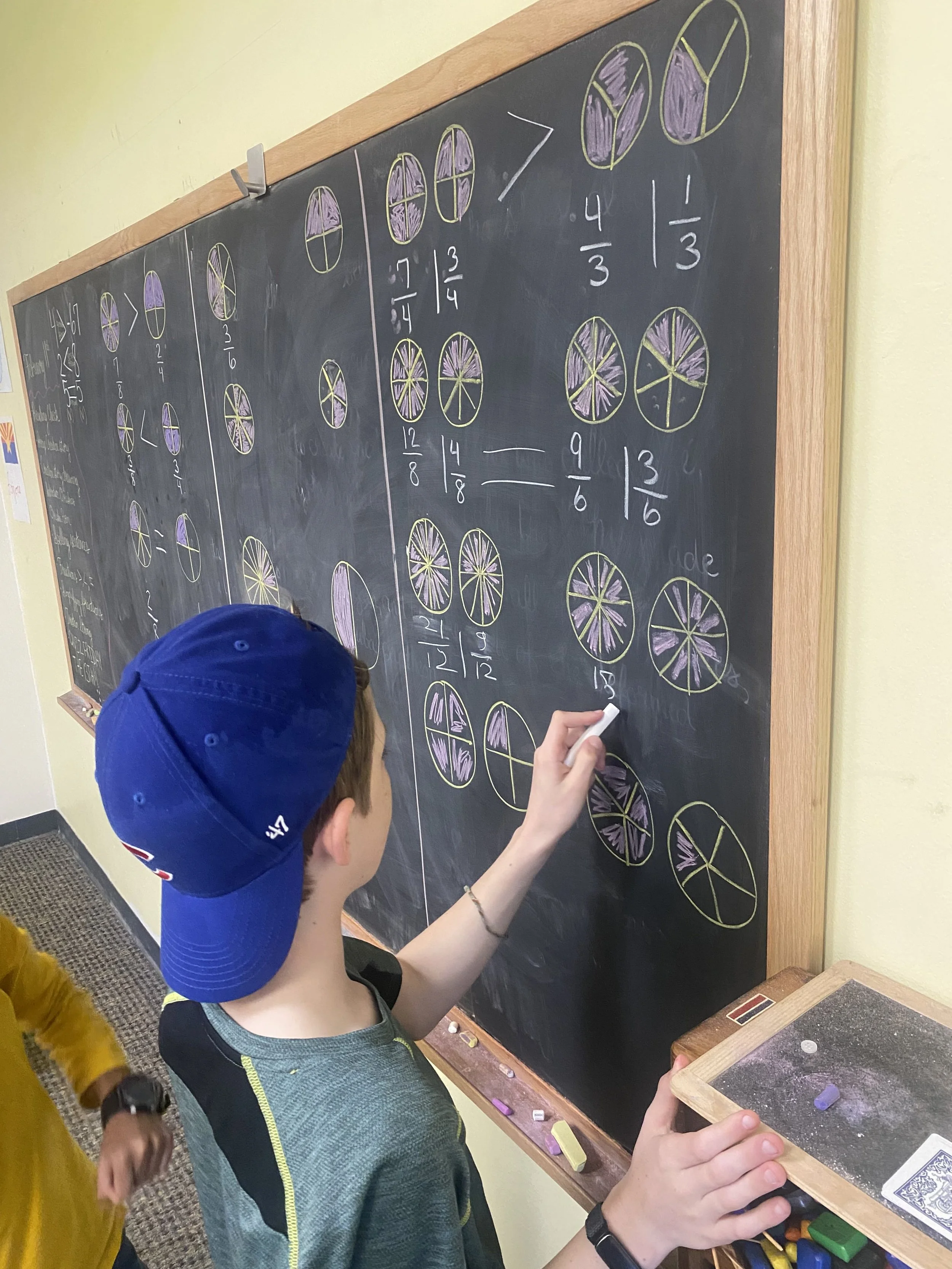 In math, the students are reviewing fractions from last year. Prior to the break, the class utilized the 4-Square court on the parking lot as a way to relearn the concept of expanding and simplifying fractions by dividing the four sections into smaller ones. During our indoor math practice, we worked on comparing fractions with different denominators and illustrating improper fractions and mixed numbers by recreating a “pizza shop” and identifying which customers ate more of their pizza or an equal amount of it. The class will continue with their fractions review, which will perfectly set them up for the Decimals Main Lesson block in March.
