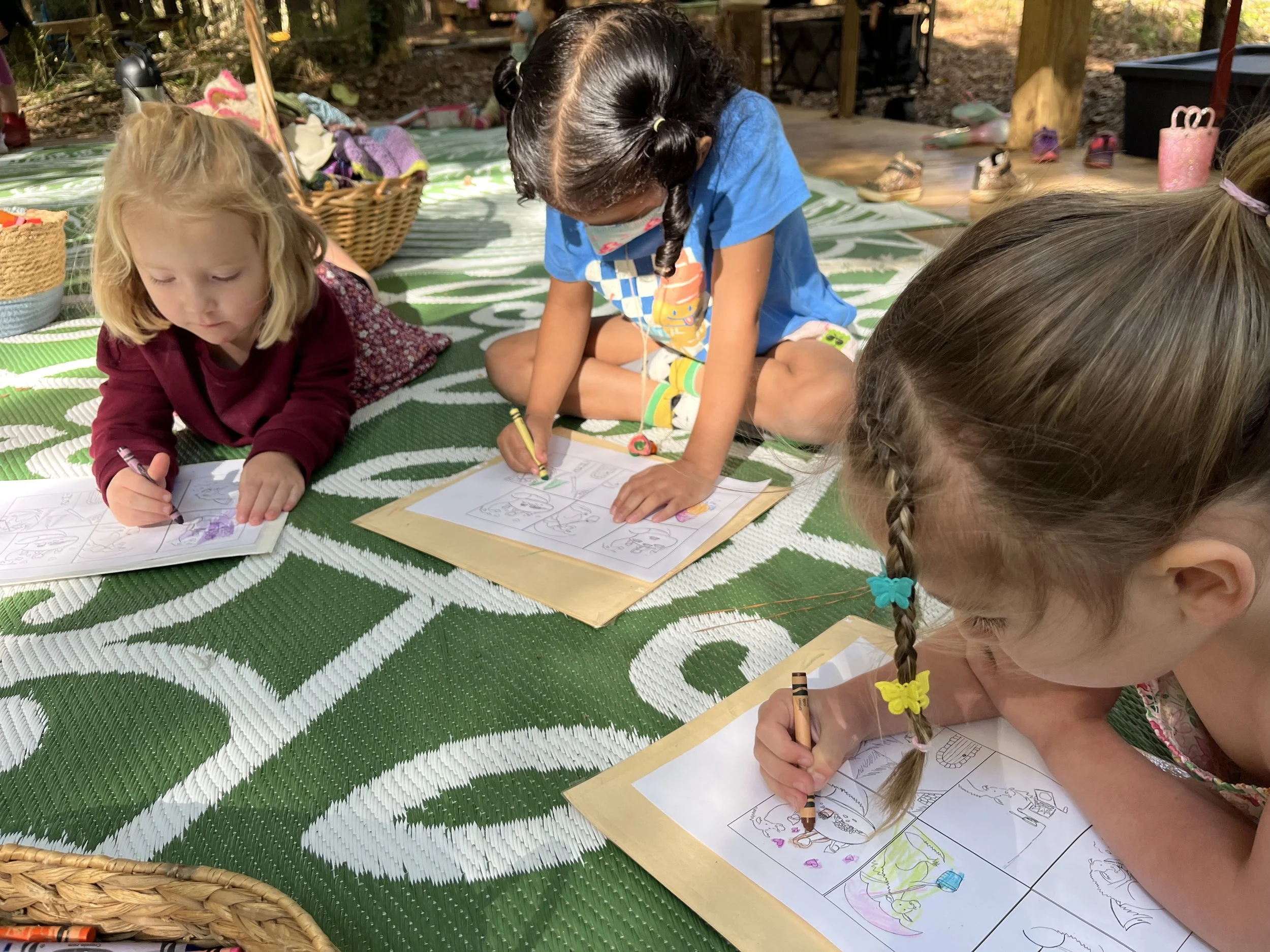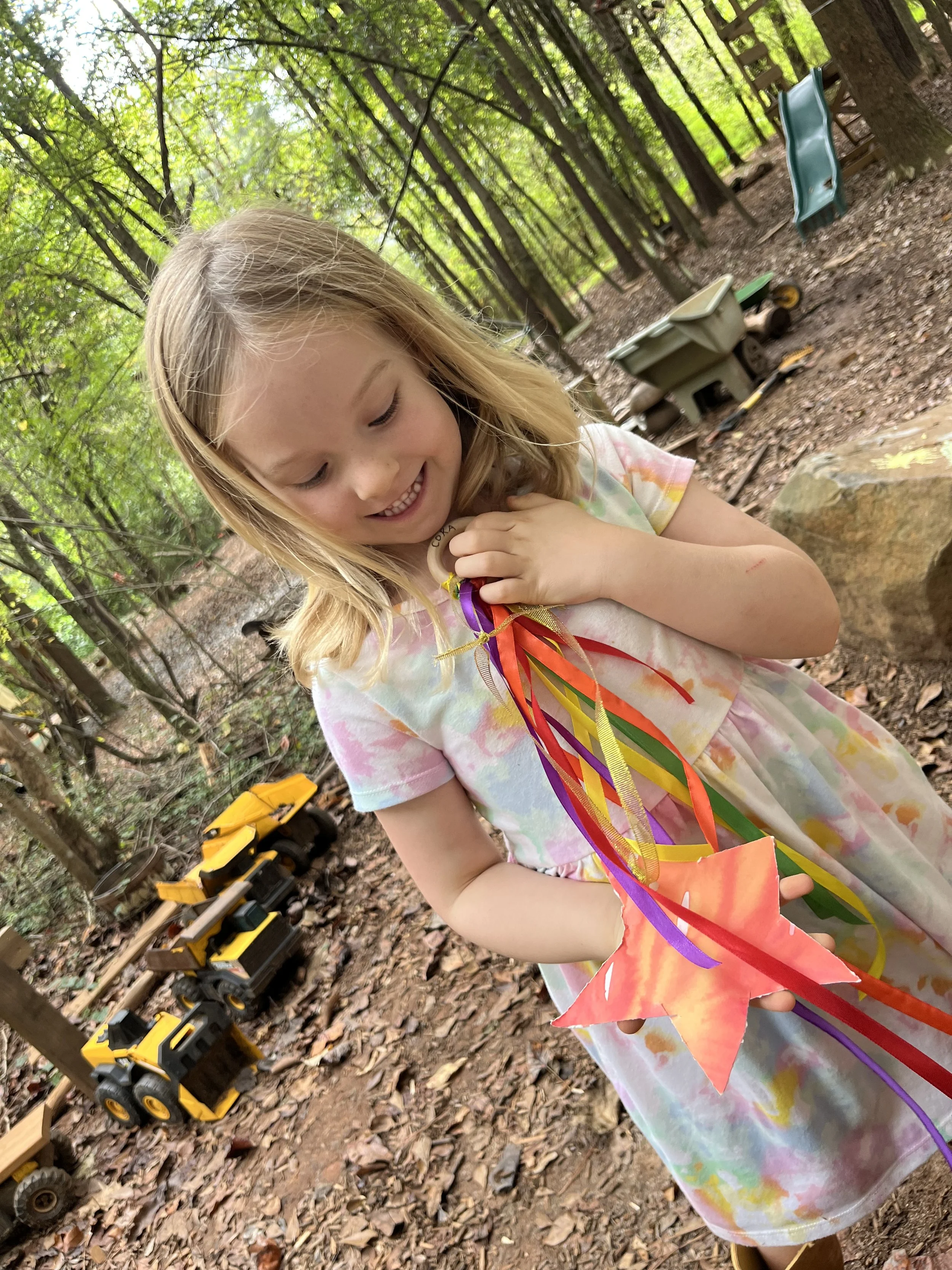 We had a great week back together! The whole class worked on a special project: shooting stars with rainbow ribbons. The children worked with teachers to tie knots, attaching colorful ribbons to wooden rings. Knot tying is a new skill for many of our kindergartners, and the children worked with focus, exercising their fine motor skills to complete their knots. This project also required scissor skills as each child cut stars from a red and yellow watercolor painting to attach to their ring. When their shooting star was complete, the children ran and played with it, granting wishes throughout the forest.