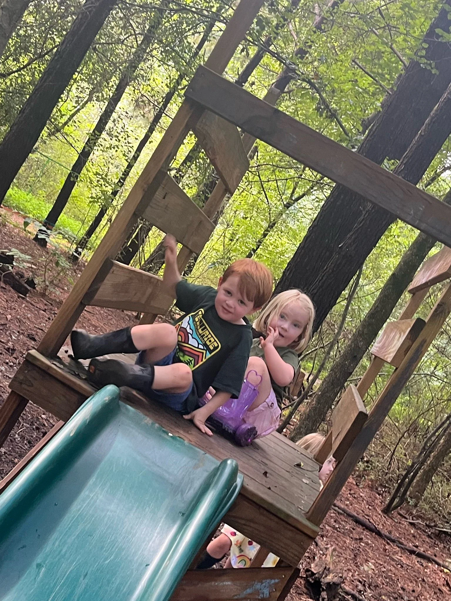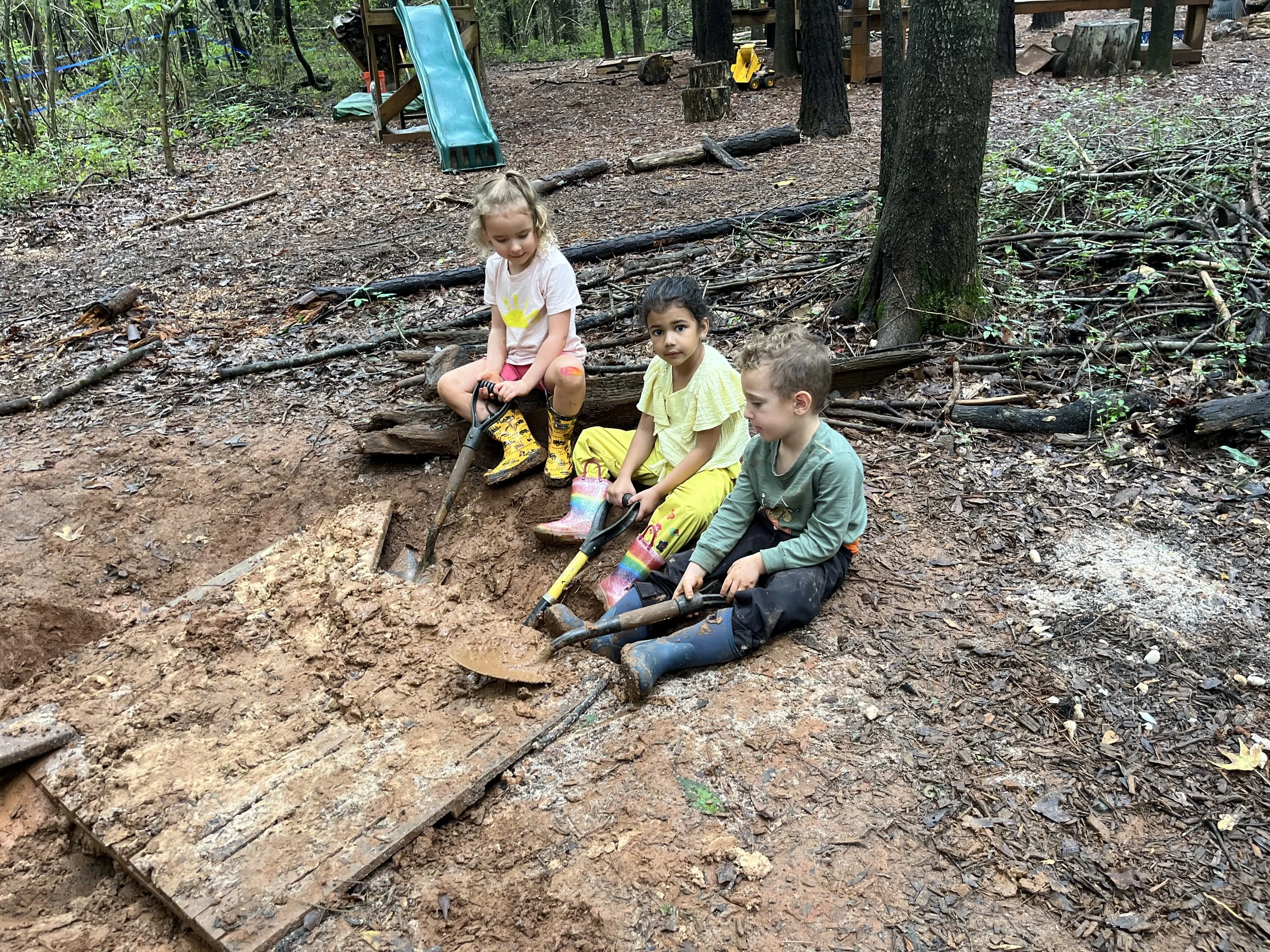 We had a lovely few days getting to know one another in the forest! It was wonderful to see our Turtle families together at Meet and Greet on Saturday, the 9th. Though our first week was short, it was filled with excitement as the children explored our forest classroom and began making new friends. Everyone played nicely together, and it was fun to watch them discover each other and all that our classroom has to offer. The mud kitchen and digging area were favorite spots in the forest, and on the platform, the children enjoyed the peg dolls and blocks. The rain each evening added just the right ingredient, water, for stirring, pouring, and creating delightful mud kitchen “specialties”. As the children played, we noticed many creatures- spiders, ants, caterpillars, birds, and butterflies that share our forest classroom with us. These moments of discovery are full of wonder and curiosity.