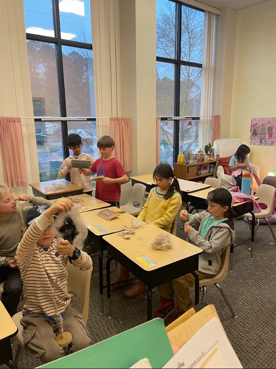 At the end of March, we visited the farm with Angora goats. Students are learning about fibers. They were busy washing the wool, dyeing it, carding it, and spinning it. We collected the flowers that we planted last year. We used these flowers to make dye for the wool. Big thanks to the parents for the jars, onion skins, and avocado pits. It was a big help for dyeing the wool. Now we are working on the class projects: knitting, crocheting and weaving.