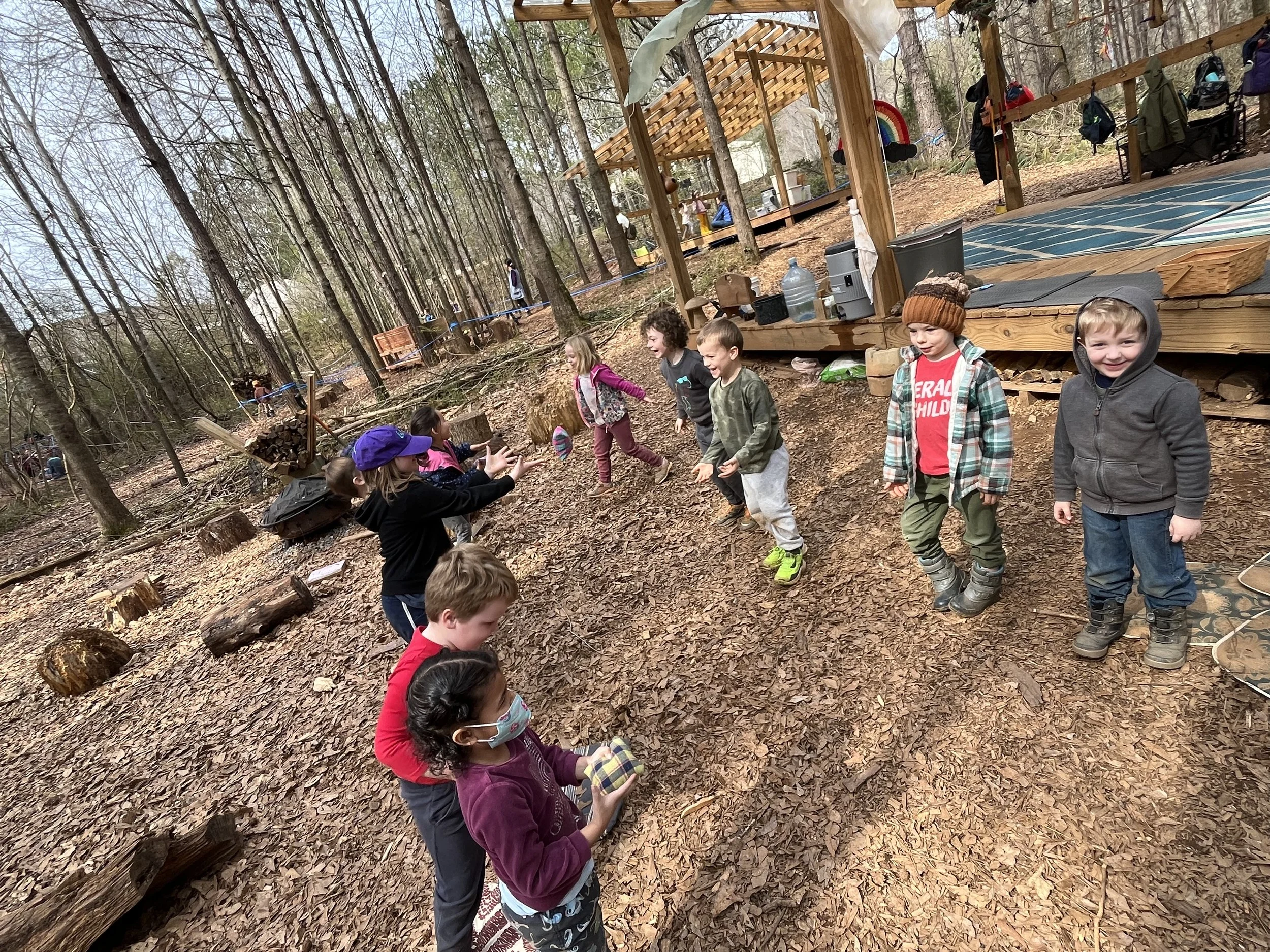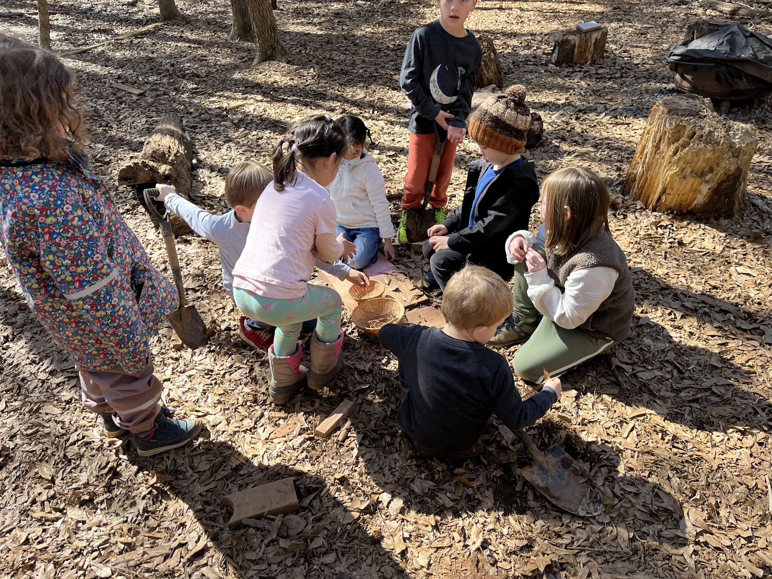 It was a beautiful sunny week in the forest. We made a special gift for the birds of our forest using cut fruit and birdseed, an extension of our story from before the break. We mixed red clay from our digging spot with water, to achieve the perfect muddy consistency. The children added layers of pine straw followed by layers of mud to small woven baskets, with each layer they took care to spread the mud thinly and then cover it well with pine straw. When the children had a nice bowl shape, they left the creations in the sun so they could dry. As they dried the mud shrank, and we could take our beautiful mud bowls out of the baskets. We found the perfect spots for our bowls at the edges of our play space. The children chopped apples and then added apples, oats, and birdseed to our handmade bowls for the animals to enjoy. It was fun to check on the bowls each morning, discover that they were empty, and then refill them.