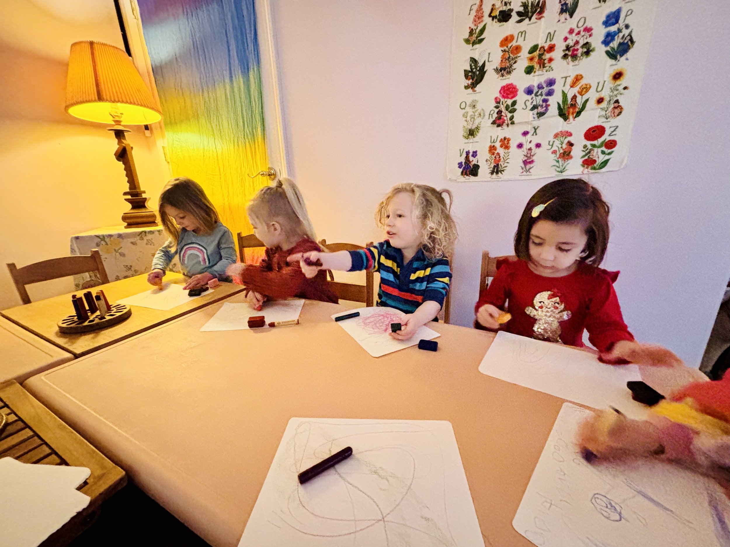 Indoors, a few new “stuffies,” a handmade baby doll, a handful of additional wooden blocks, and the simple exchange of one wooden tow truck for another were enough for some children to declare the classroom entirely “new.” During our cozy morning time, the children colored with beeswax crayons, listened to a new story about a lost mitten, and enjoyed a sweet fingerplay about five snow children. Those children nearing four years old are beginning to form more recognizable human figures with heads and radiating lines in their drawings. This marks an important developmental step as inner images of self and others begin to awaken and find expression on the page.