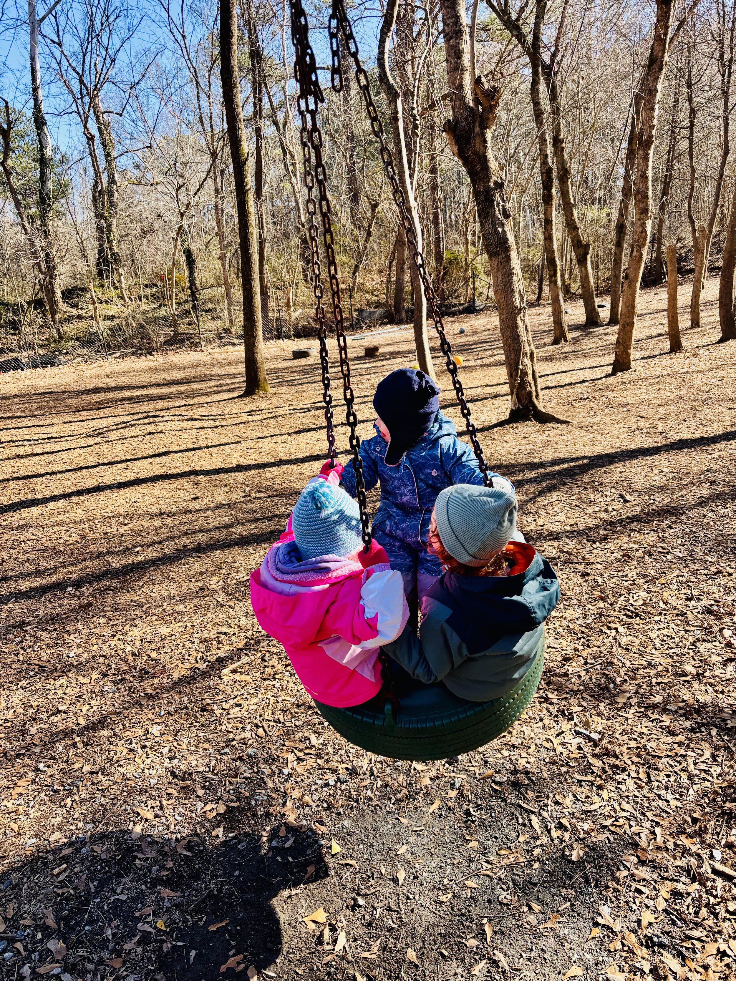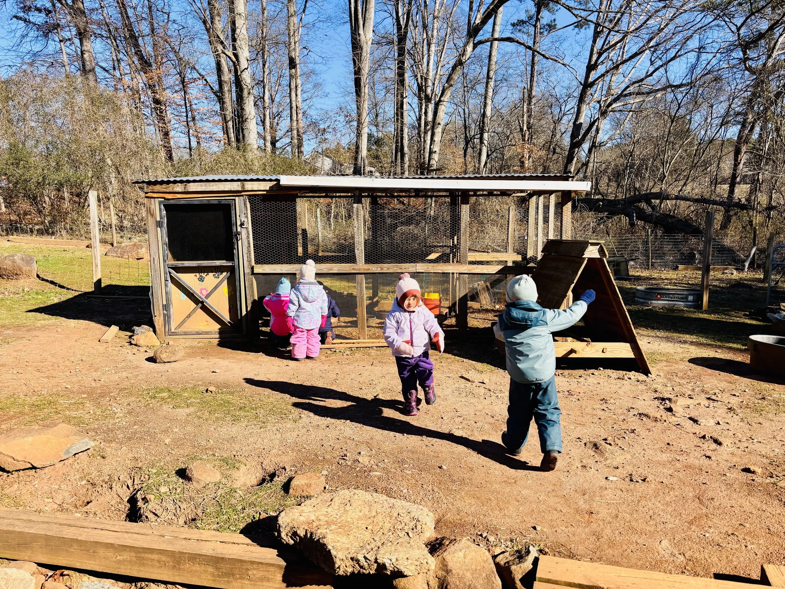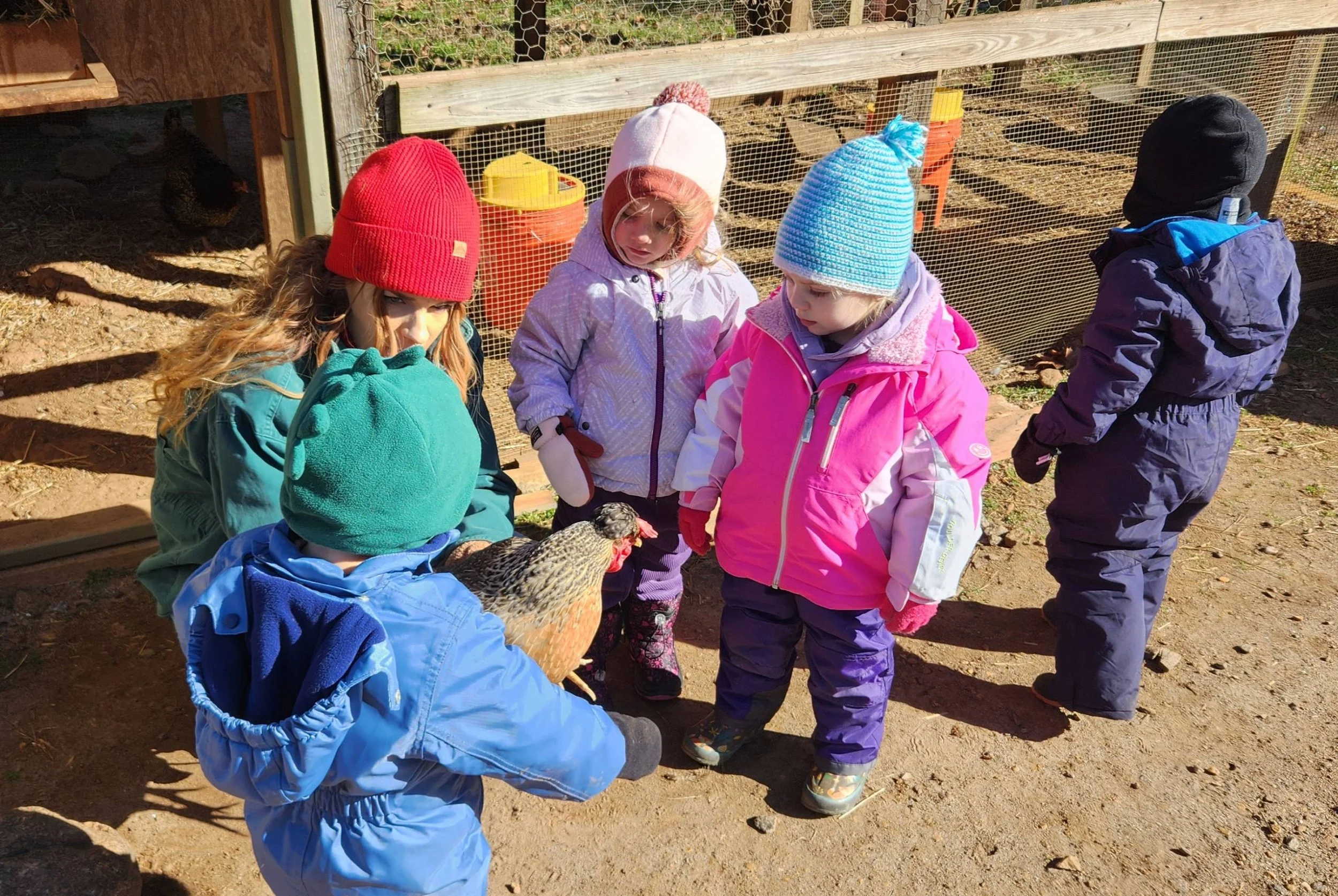 Last week, the children showcased their ever-growing sense of comfort and confidence within the school rhythm and in the forest itself. Even on very cold days, they managed multiple layers of winter gear with impressive independence, discovered new trees to climb in our forest classroom (carefully testing each branch for sturdiness), attempted to hold chickens at the farm with tenderness and care, and moved with increasing skill and intention in their watercolor paintings.