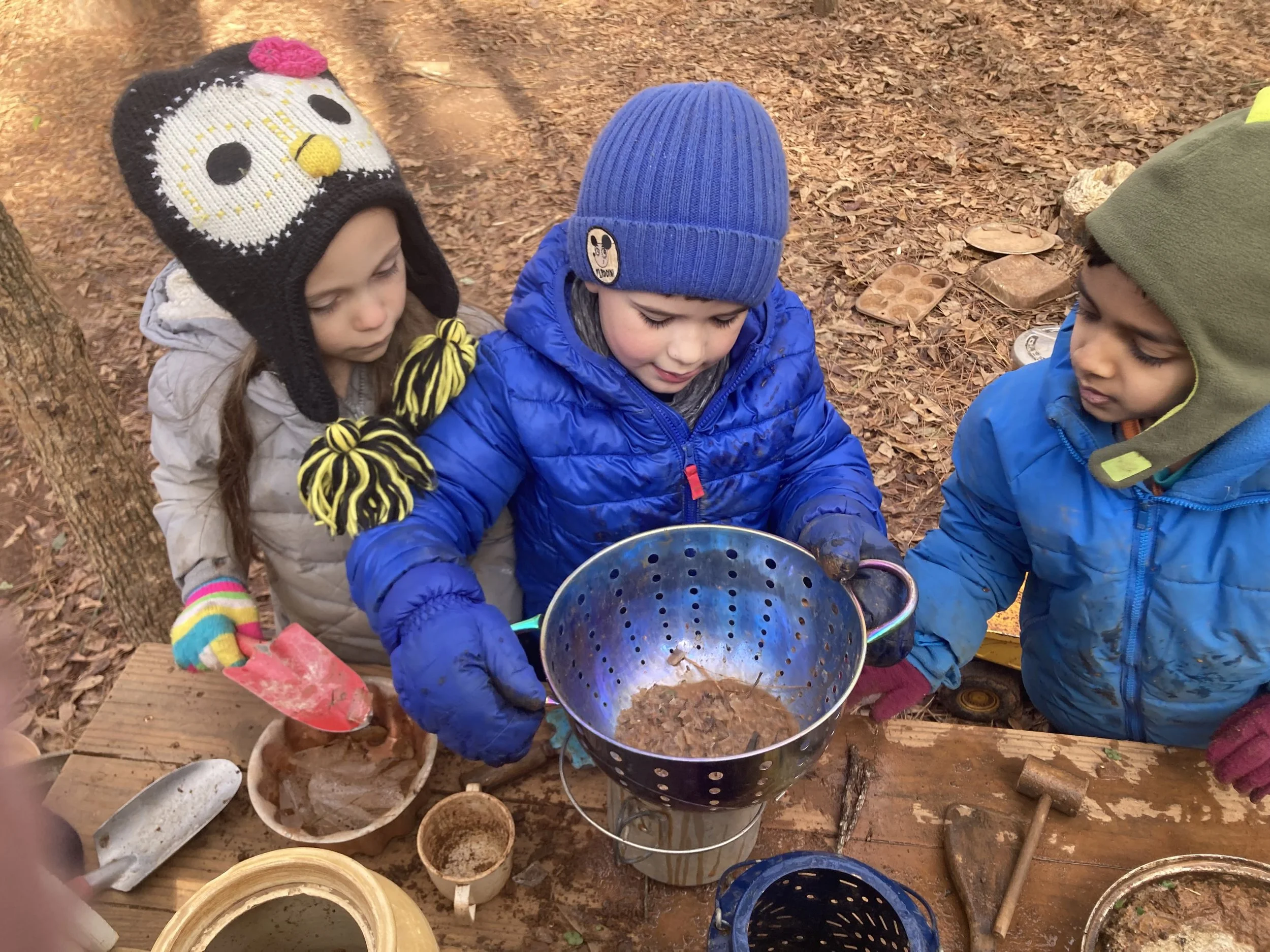 Last week’s weather was perfect for our morning circle about King Winter and Jack Frost bringing cold and ice to the land. The circle includes songs and verses that allow the students to practice bundling up for the cold weather, along with cutting down trees and chopping firewood. Next week, the children will begin learning a new song to add to the current circle. The new song will include several animals and the different ways they keep safe and warm in the cold. The Chickadees also sing a special song on cold mornings to help them remember what order to put on their gear. It can be extra challenging to get dressed with gloves on, or to put on snow pants when boots are already on, for example. Ask your child to share the song with you; they know it well! The words are sung to the tune of “Head, Shoulders, Knees, and Toes”: