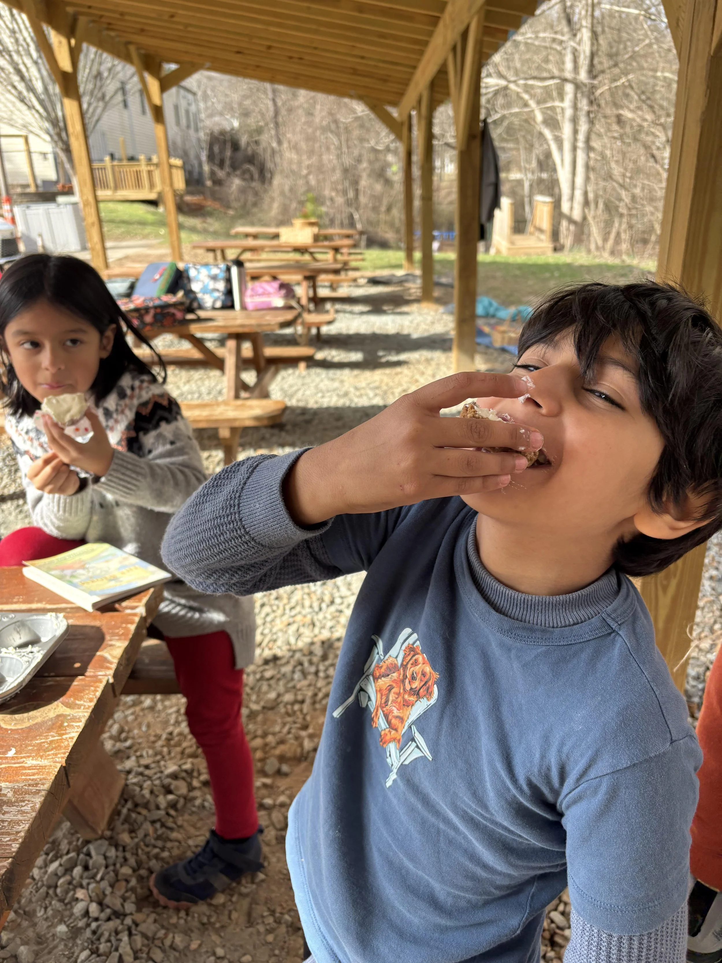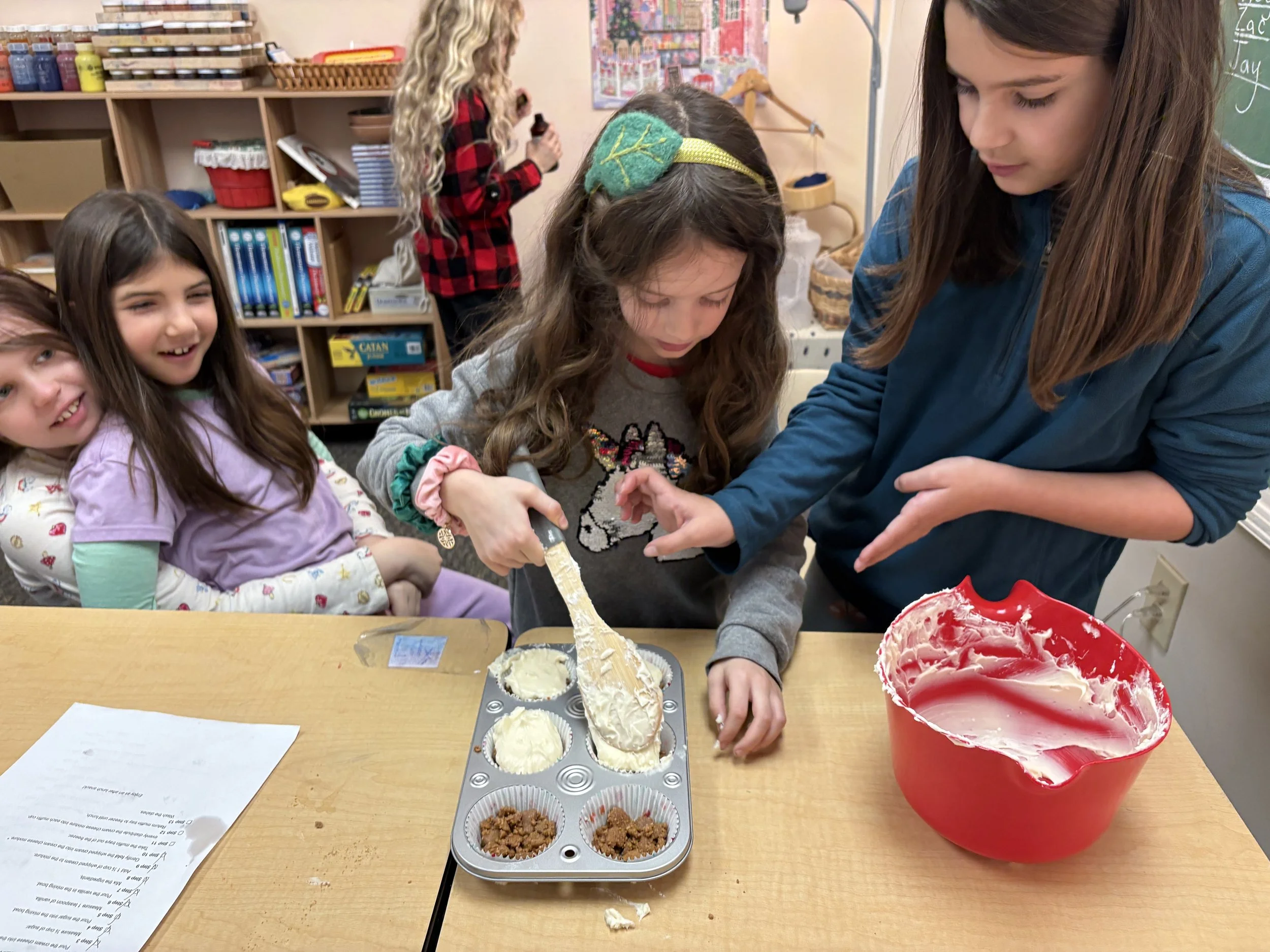 Last week, the class explored measurement with length and volume. They worked with buckets of water to discover how many cups are in a gallon, quart, and pint, and how many teaspoons and tablespoons are in a cup. The students also looked at different ways to measure volume around the school, such as the water tank near the platform and the watering cans at the farm, and discussed the appropriate unit to use for measuring different objects. On Wednesday, the children followed a recipe independently and made no-bake cheesecake using the skills they had practiced earlier in the week.