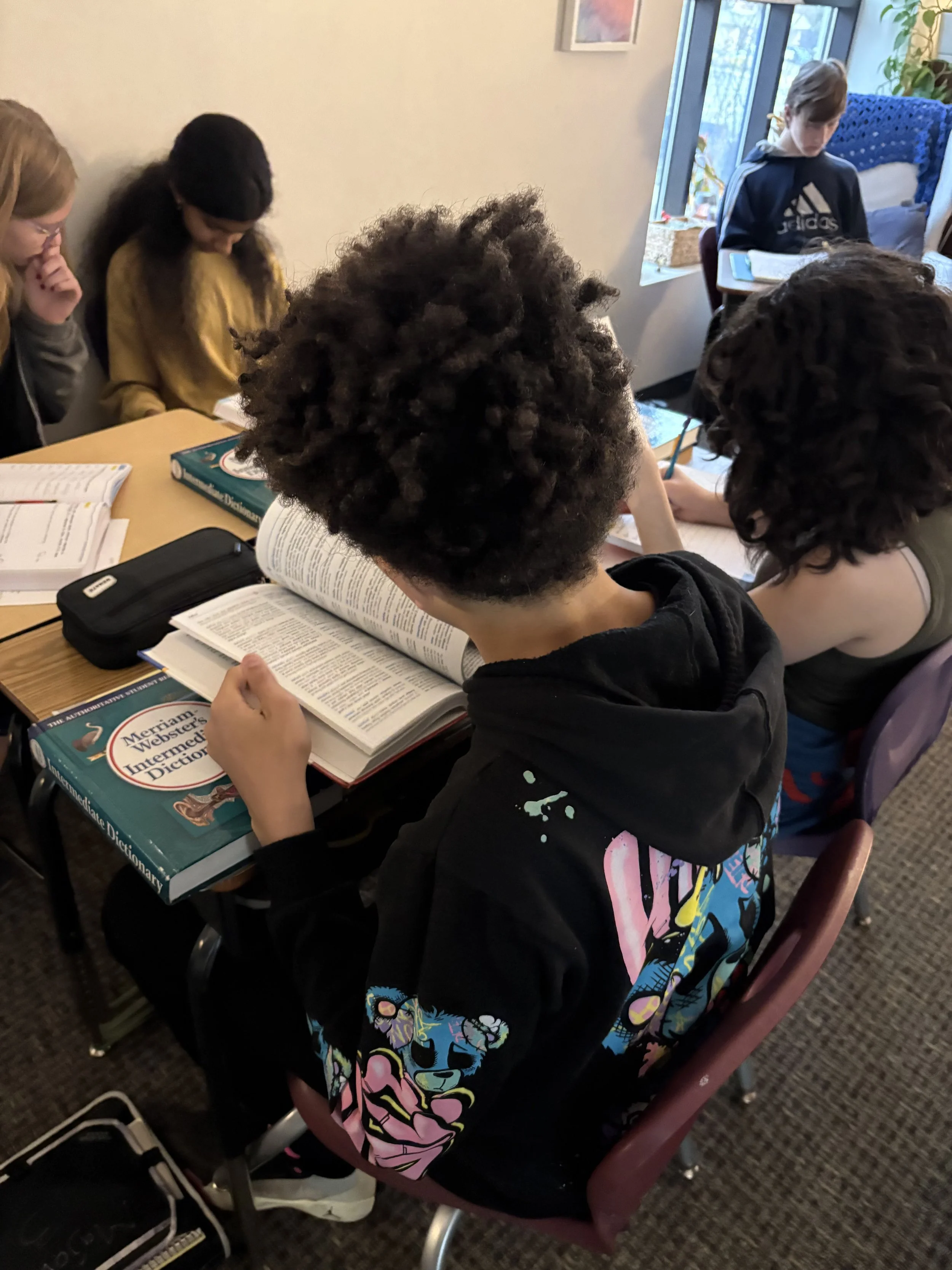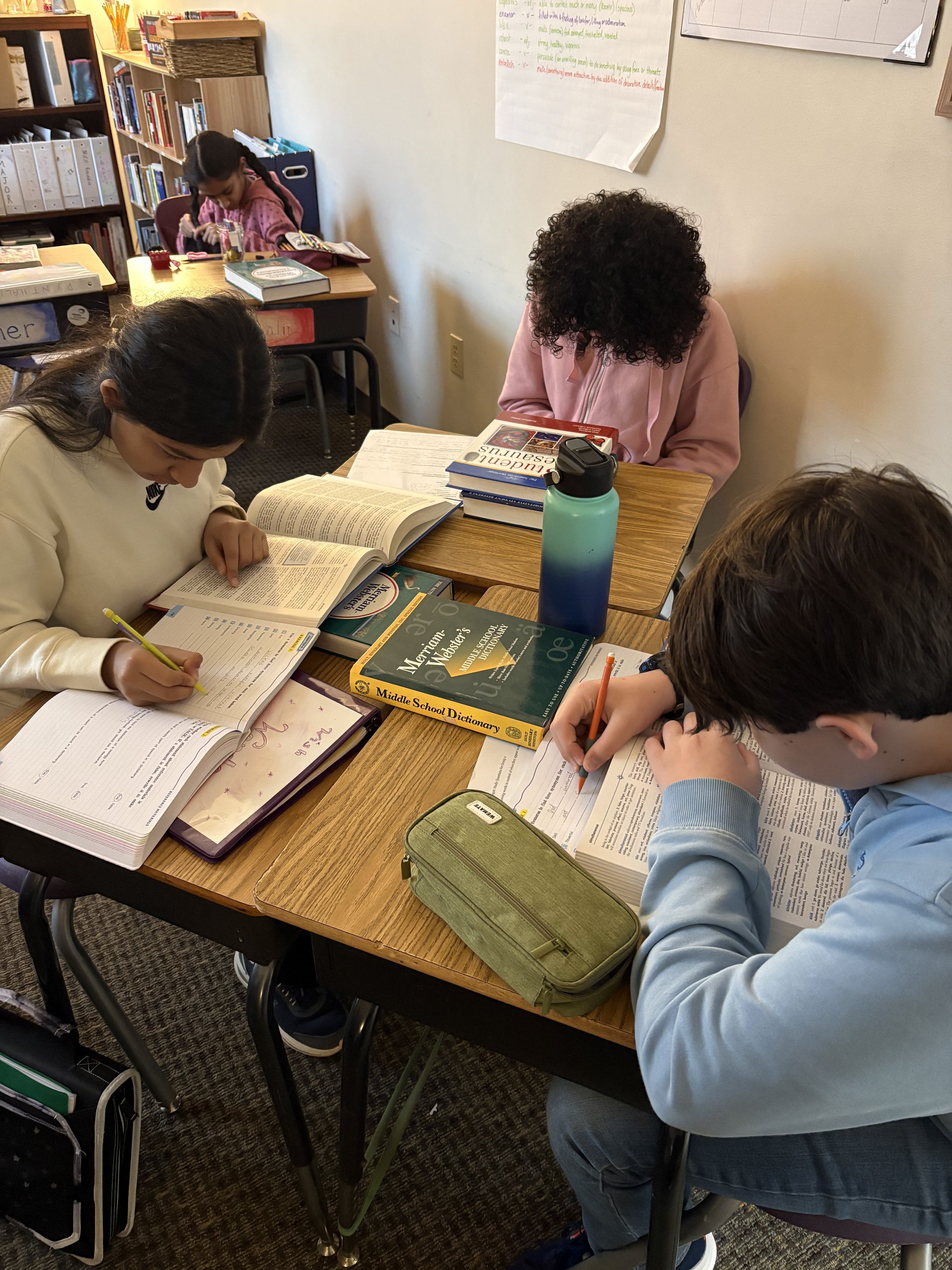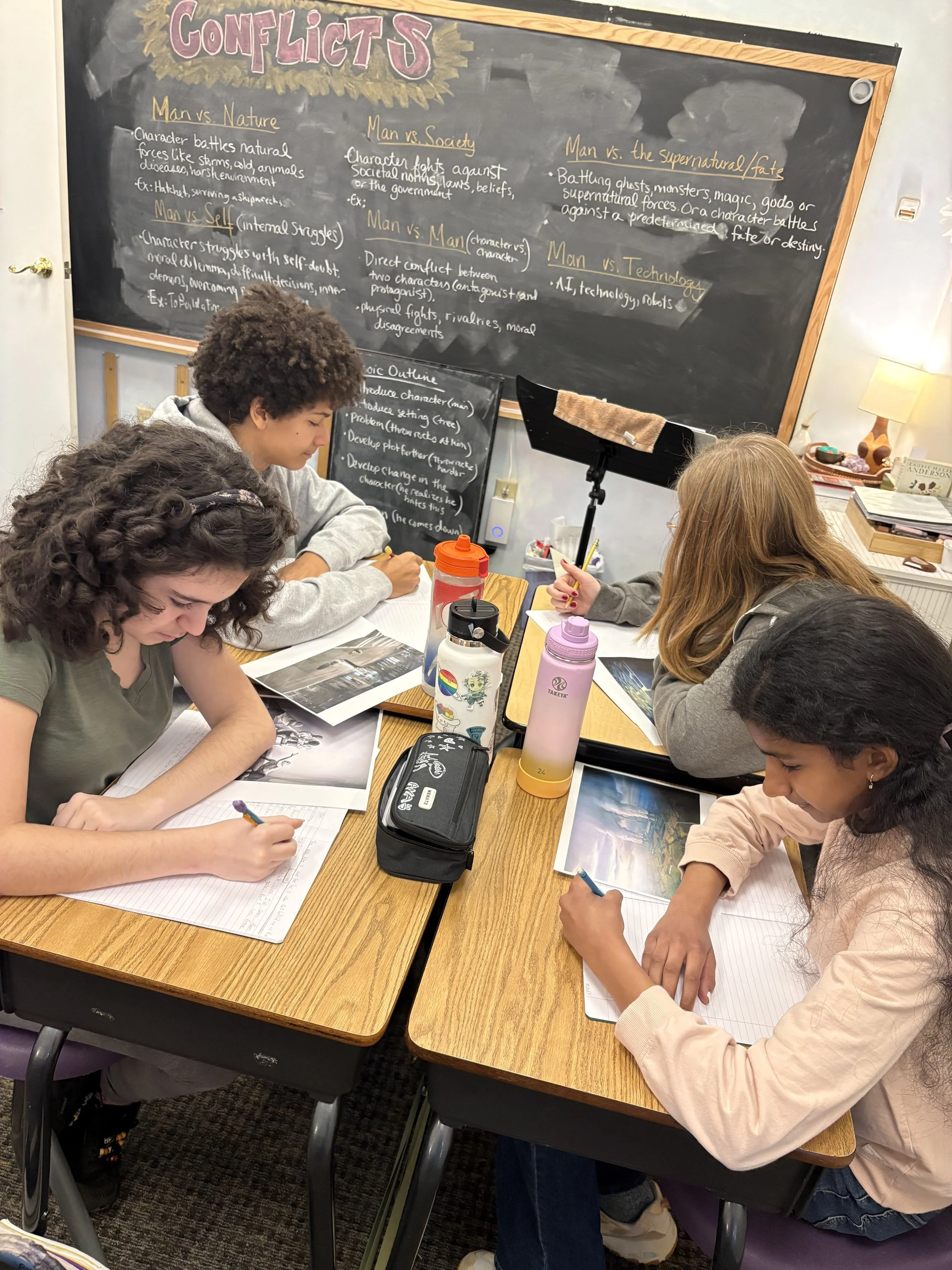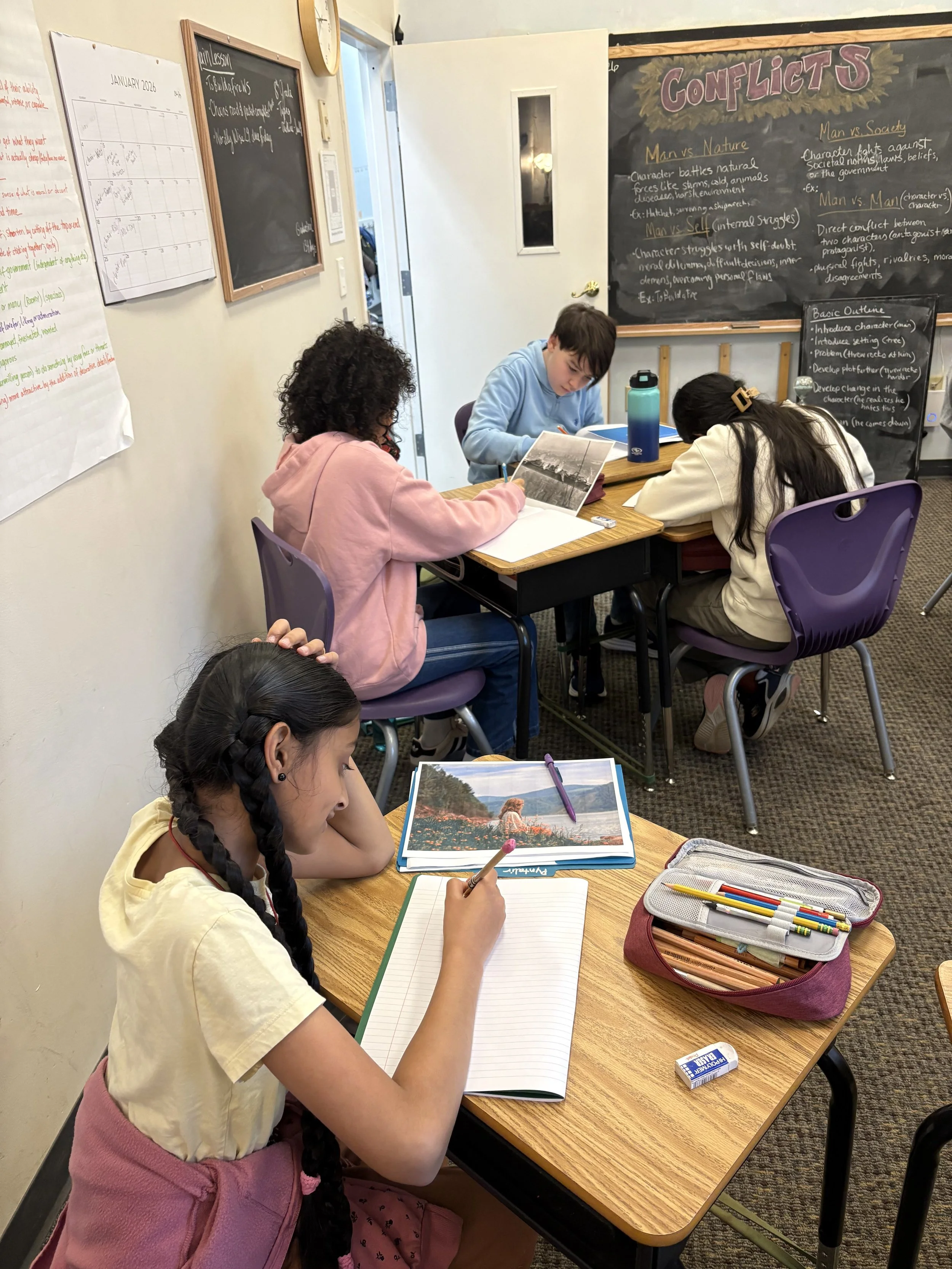 Students continued to work on their own short stories, using pictures as prompts for inspiration. Along with this block, the class practices grammar and punctuation concepts, both in practice sheets and by editing their own work. In particular, this past week’s focus was on correct punctuation for dialogue, so that these skills can be incorporated into their short stories effectively.