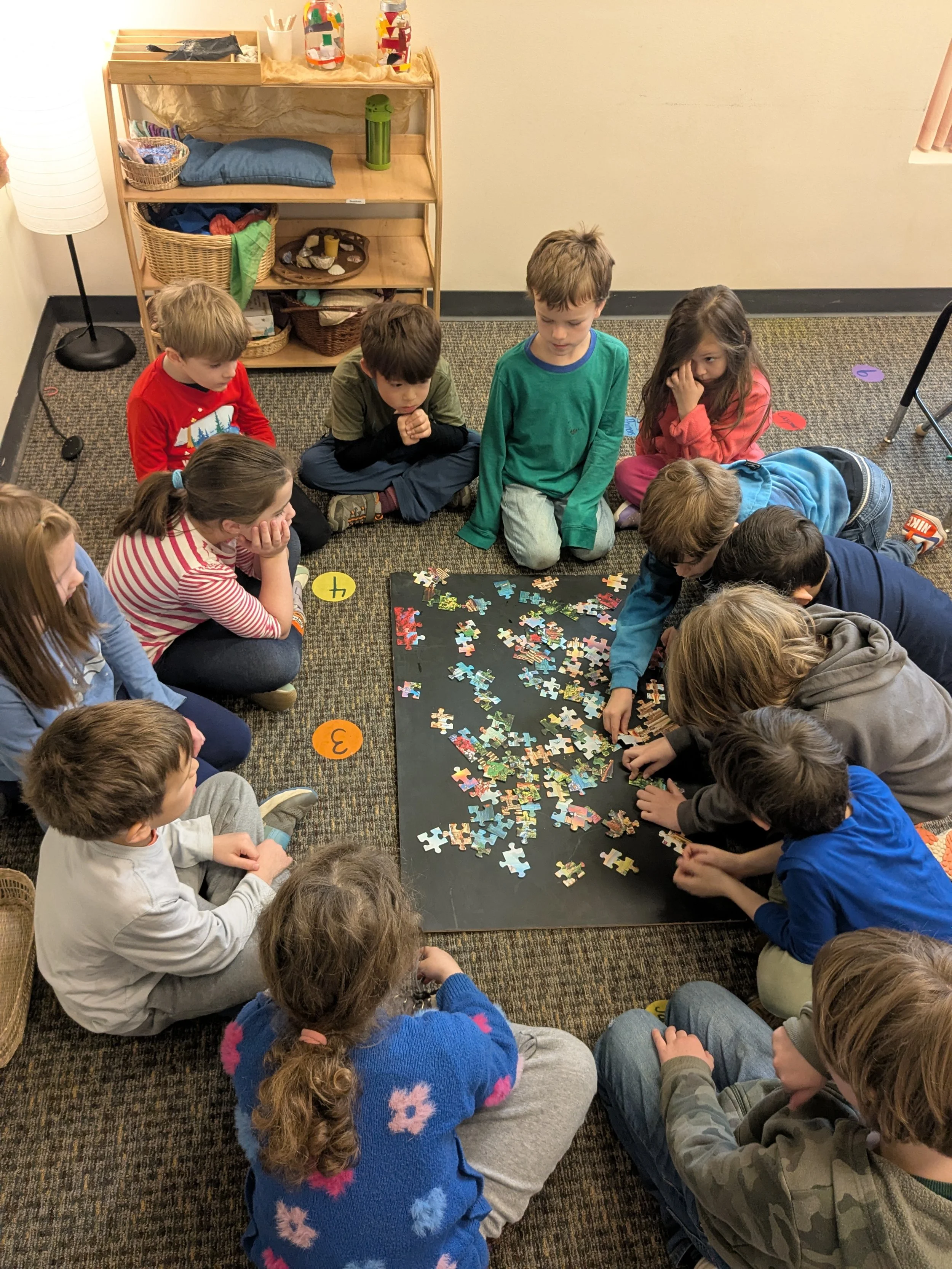 Wintry weather has truly arrived, and the nature imagery in our Circle poems and songs in addition to our artistic activities have reflected the seasonal change. The pensive mood of a still winter day inspires quiet feelings that can be poured into painting and drawing snow scenes. Students enjoyed painting their first human figure. Arms outstretched, the children saw themselves in their painted subjects. By carefully cleaning and wiping their brushes, they were able to use them to remove paint in order to create a snowball and snowflakes.