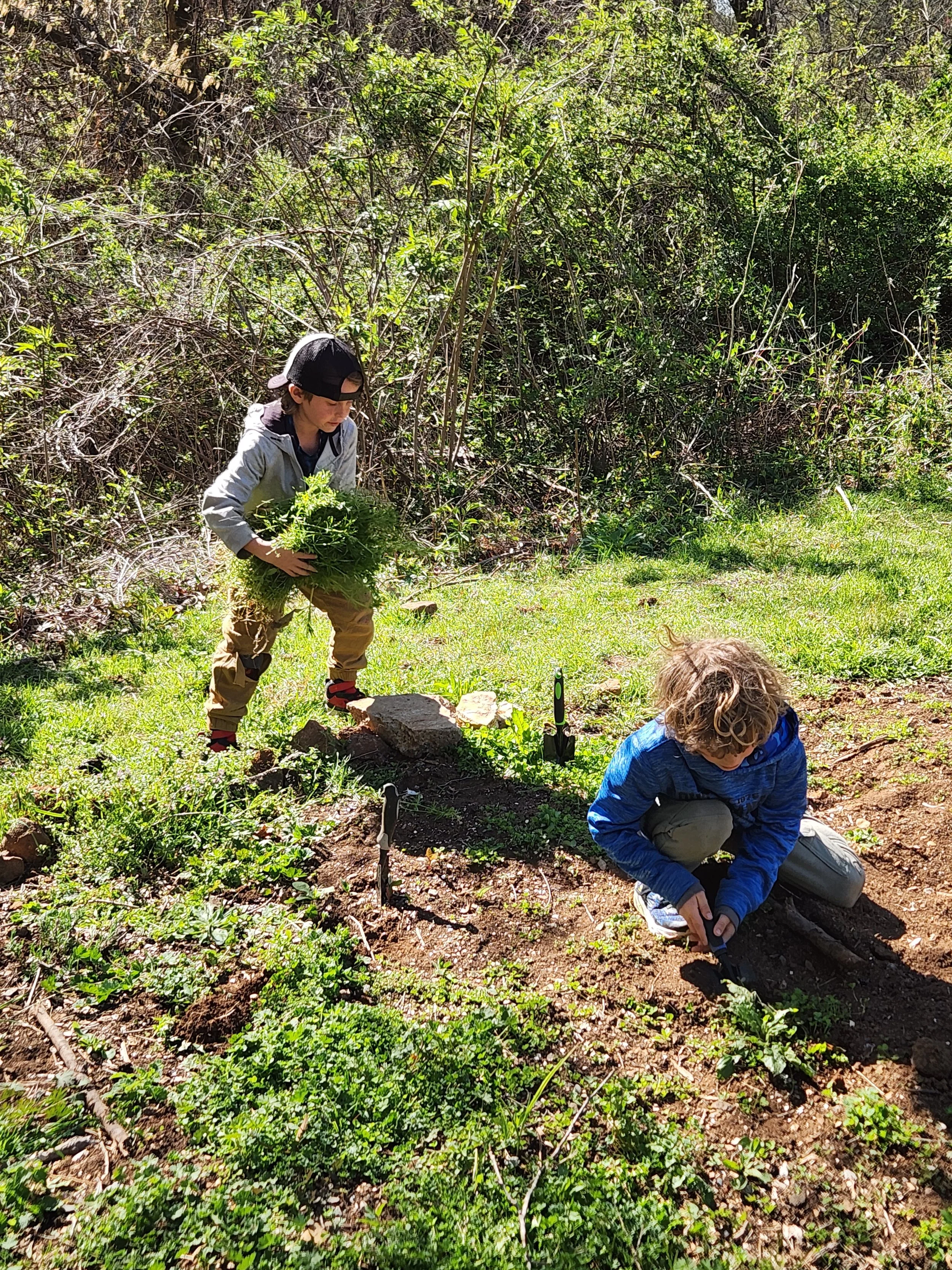 Students have been direct sowing radishes, carrots, and spinach seeds in succession every couple of weeks for animal treats, as well as a small bed of wheat. Seed trays have been started with our warm weather crops. We cleaned out a garden bed to plant our pollinator flowers and will soon be planting a different area with dye flowers that will be used for handwork projects next fall. We are also tending potted hardwood cuttings that we propagated, including mulberry, elderberry, lavender, and rosemary. Next year, our new mulberry trees will support the Third Grade silkworm project, providing them with their natural diet from trees on our campus. Soon, we will harvest the green tops from our walking onions to chop and dehydrate for long term storage.