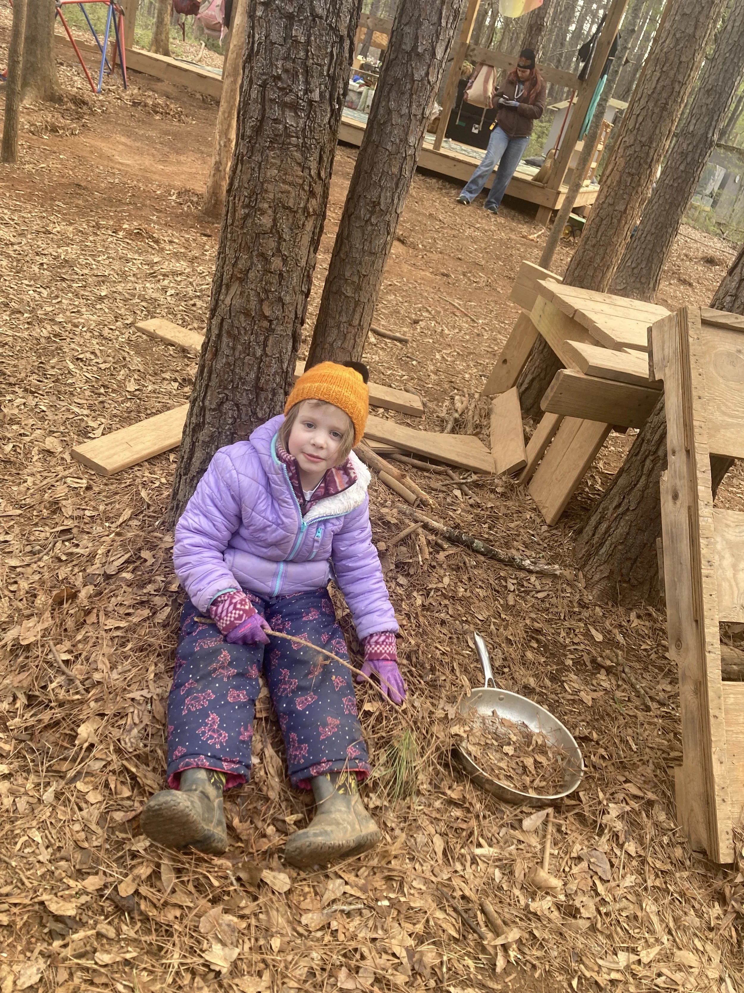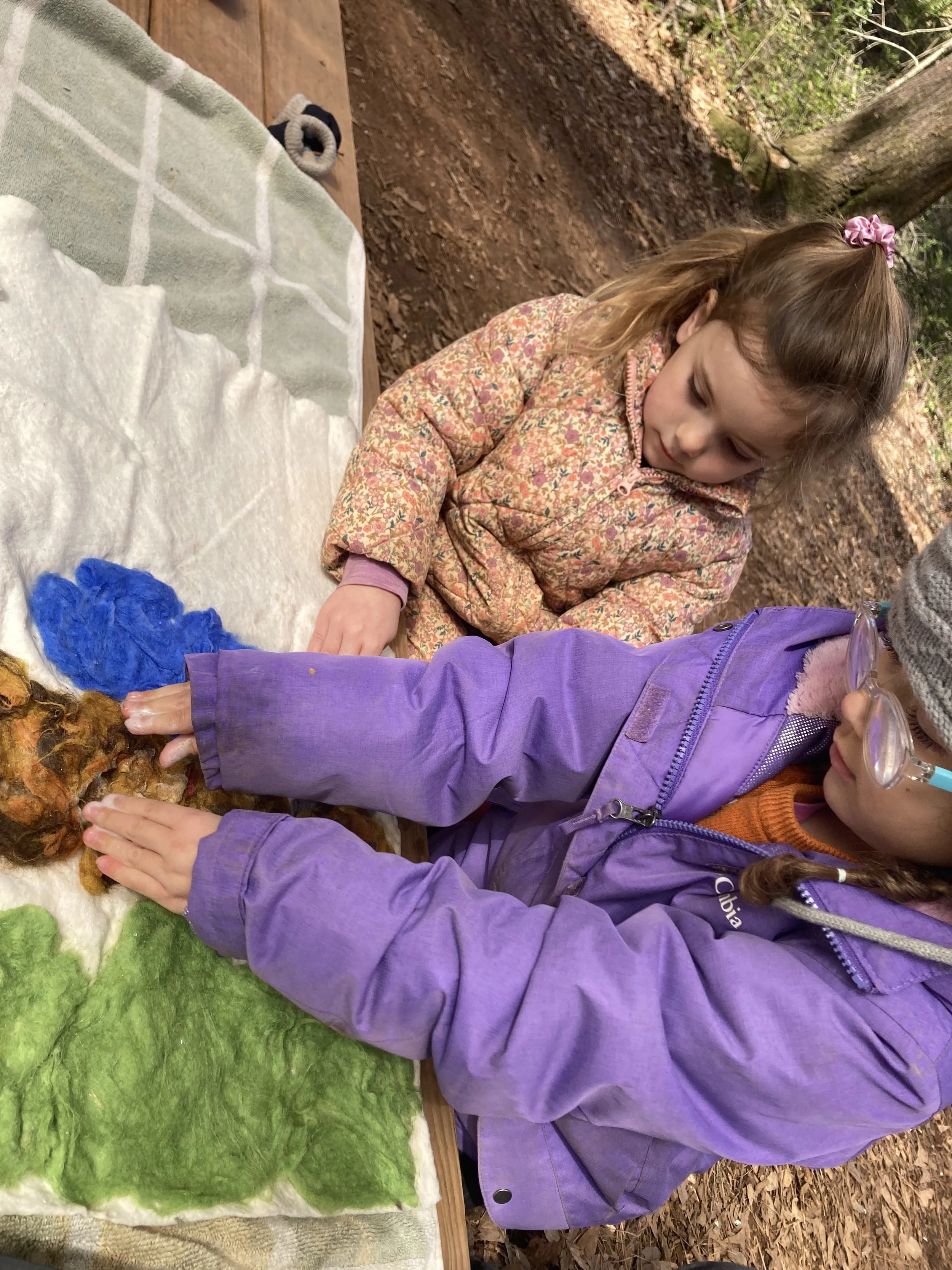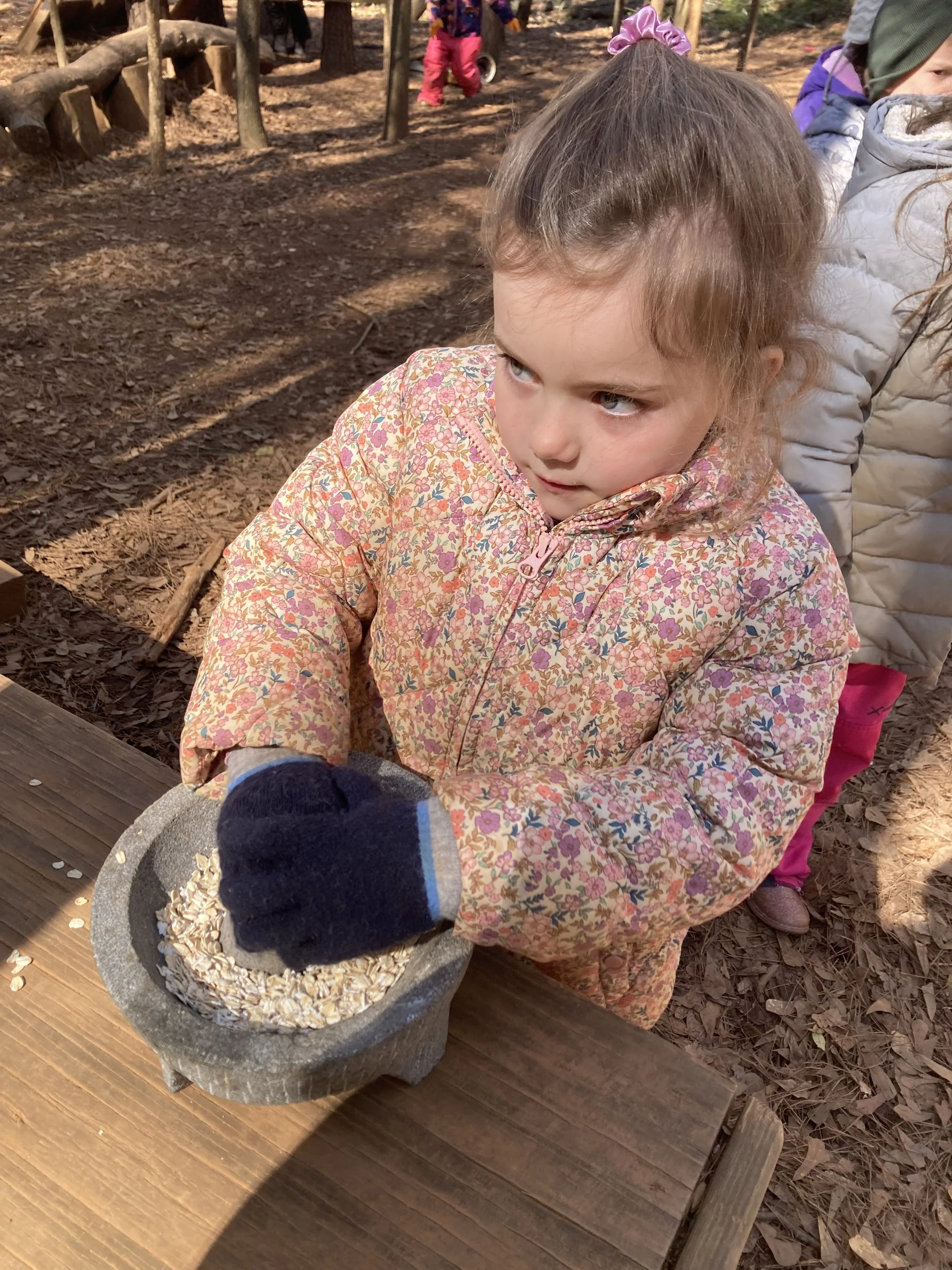 The wet-felted play mat for our class auction project is well underway! The Chickadees are learning patience and perseverance through their work, which takes several days to complete and utilizes certain techniques, as well as hand strength and dexterity. The mat has green for the garden area, blue for a small creek, and brown for the animal area. Once the play mat is complete, students will wet-felt eggs and the climbing rock. The class continued to build their hand strength and movements as they ground oats into flour using a stone mortar and pestle. Free play time this week was filled with digging and mud kitchen play.