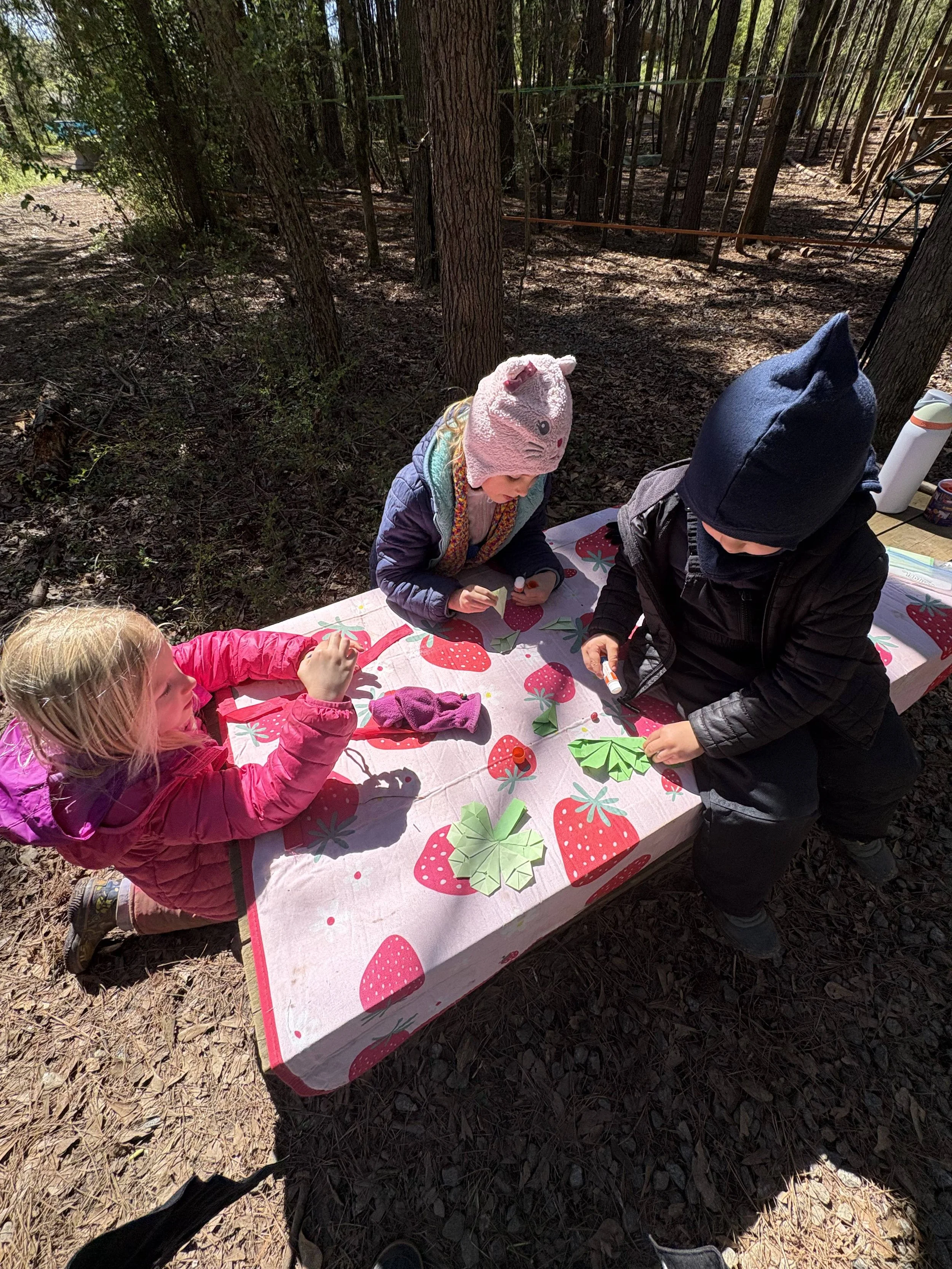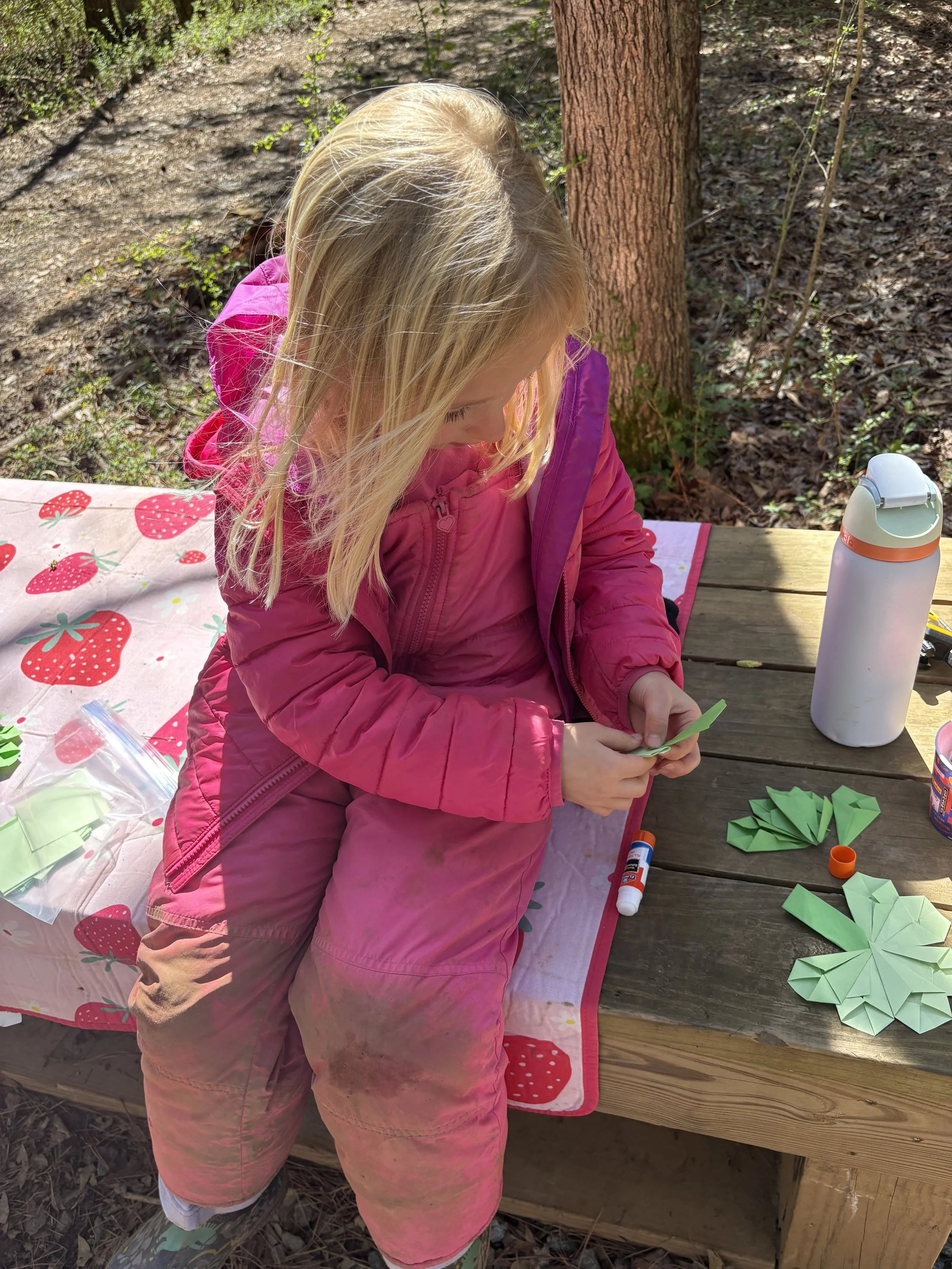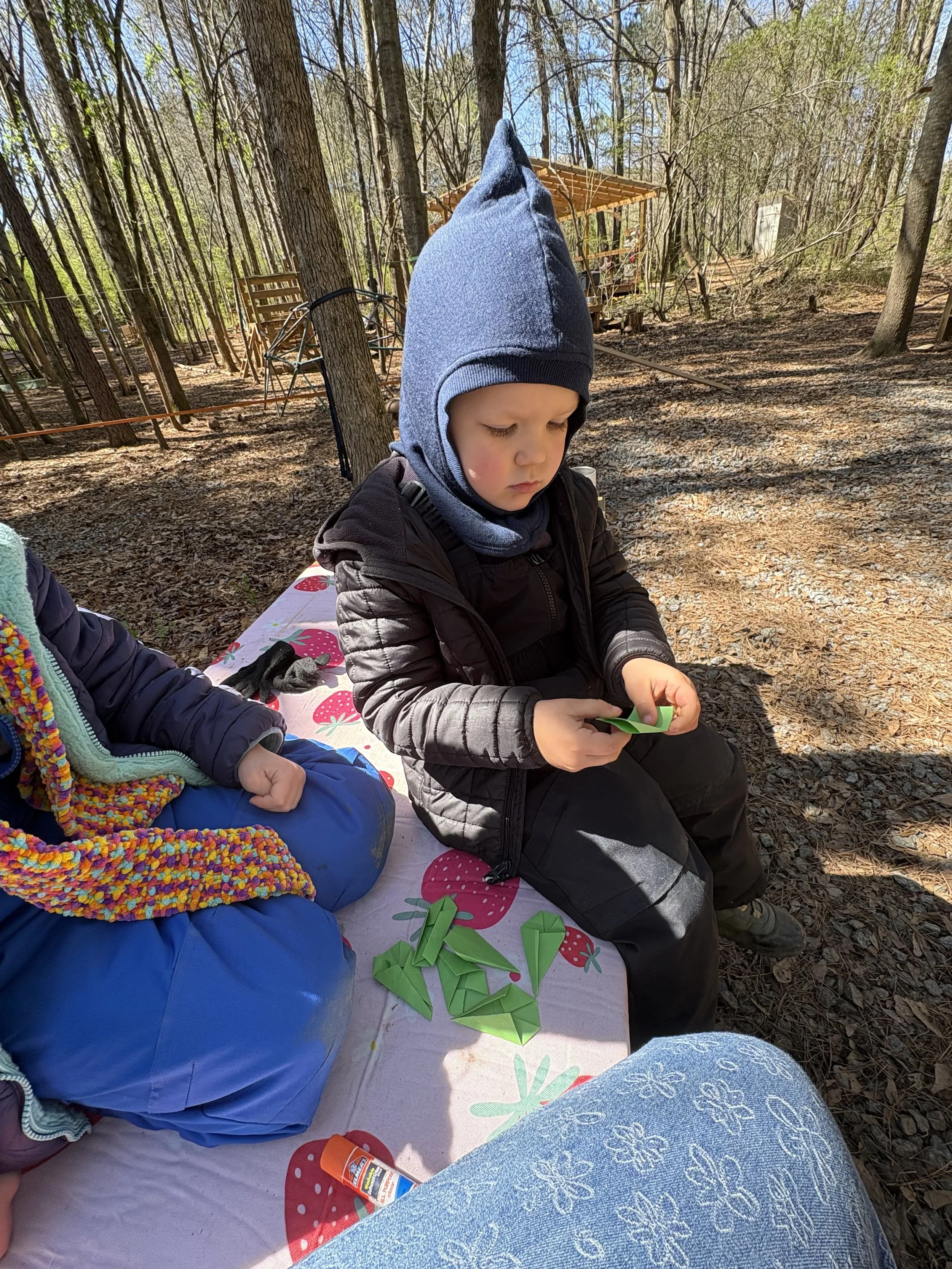On another day, a frosty morning greeted us, but the children soon warmed into the joy of St. Patrick’s Day. With only blue and yellow paint, they carefully mixed and discovered the many shades of green, watching colors transform beneath their brushes. We listened to a festive story and created shimmering shamrocks with kite paper, the children thoughtfully folding and gluing each piece with care.