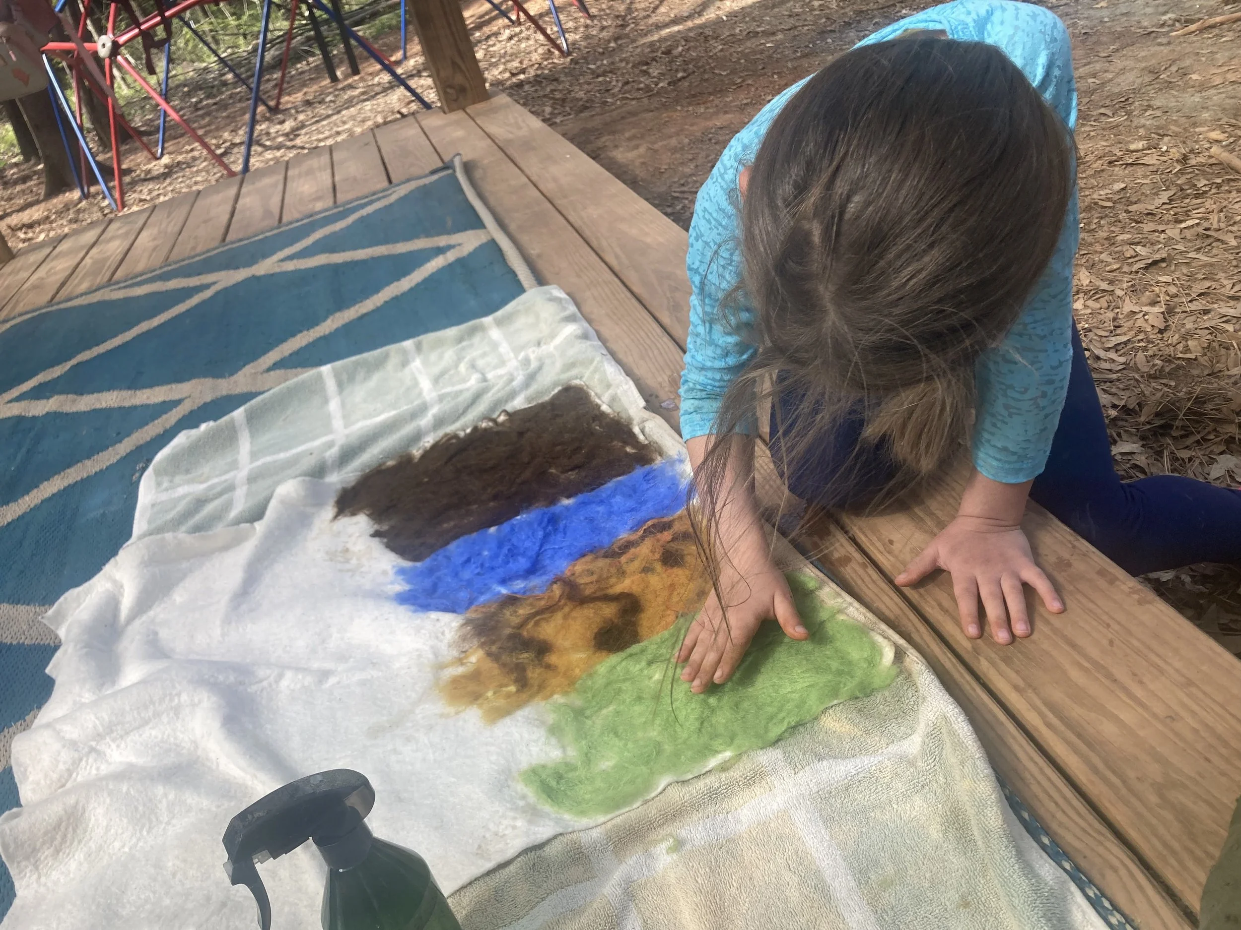 The Chickadees were very busy with creative and practical work last week. Throughout the week, students worked on the felted play mat, using warm, soapy water to felt the colors onto a cotton batting back. They will continue to work on wet felting for the auction project this week. On Thursday, the children painted using all three colors in any order and combination they desired. Everyone spent a great deal of time and concentration on their work, many adding details such as shapes, shading, and other design elements. Students also worked throughout the week, creating little gardens to take home in a few weeks. They added potting soil to planters, sprinkled wheatgrass seeds, gently placed zinnia seeds on top, sprinkled more soil over the seeds, and watered them before setting the pots in a sunny spot on the platform. Throughout this process, the students needed to utilize listening skills and follow multi-step directions with care and precision.