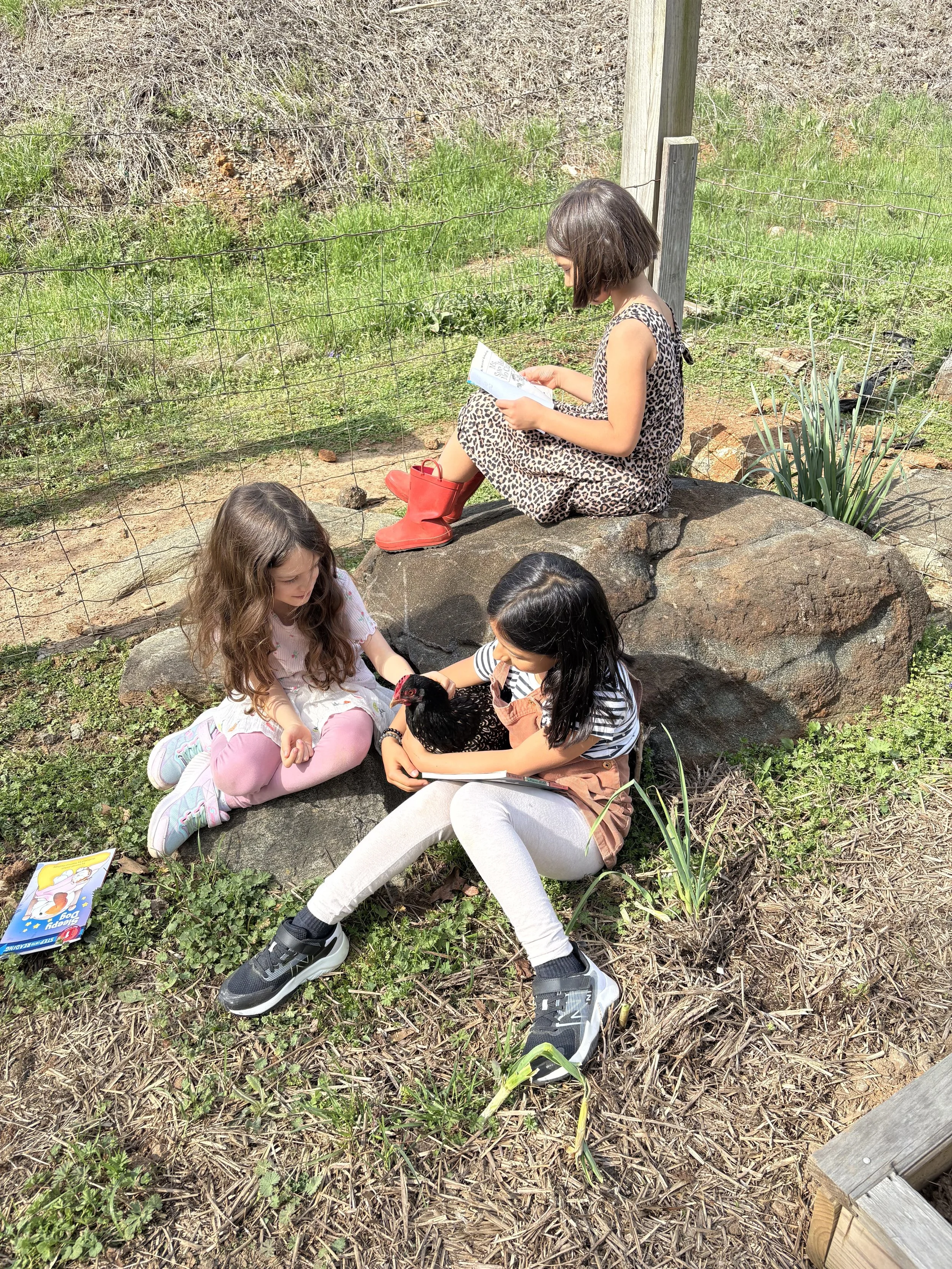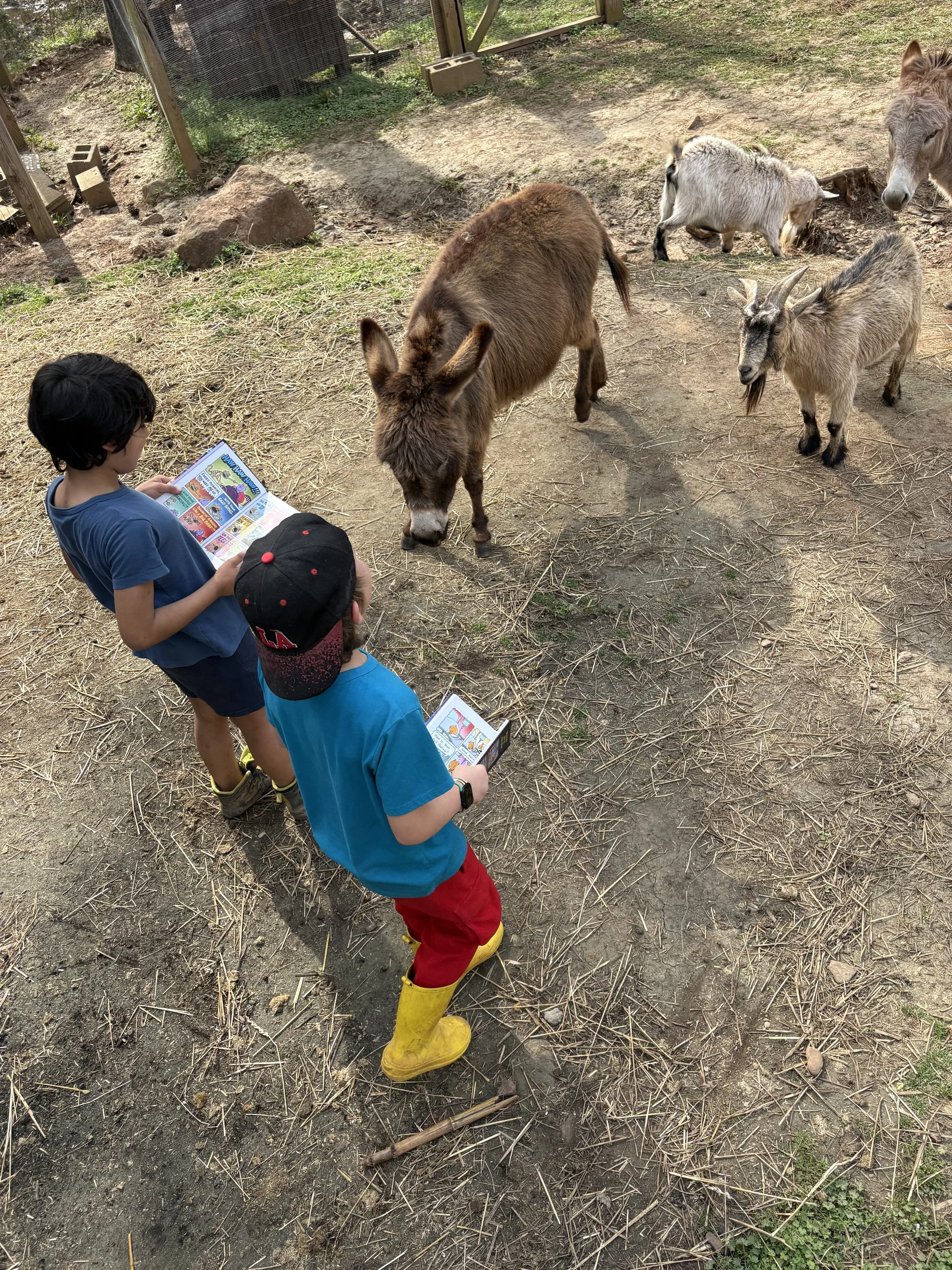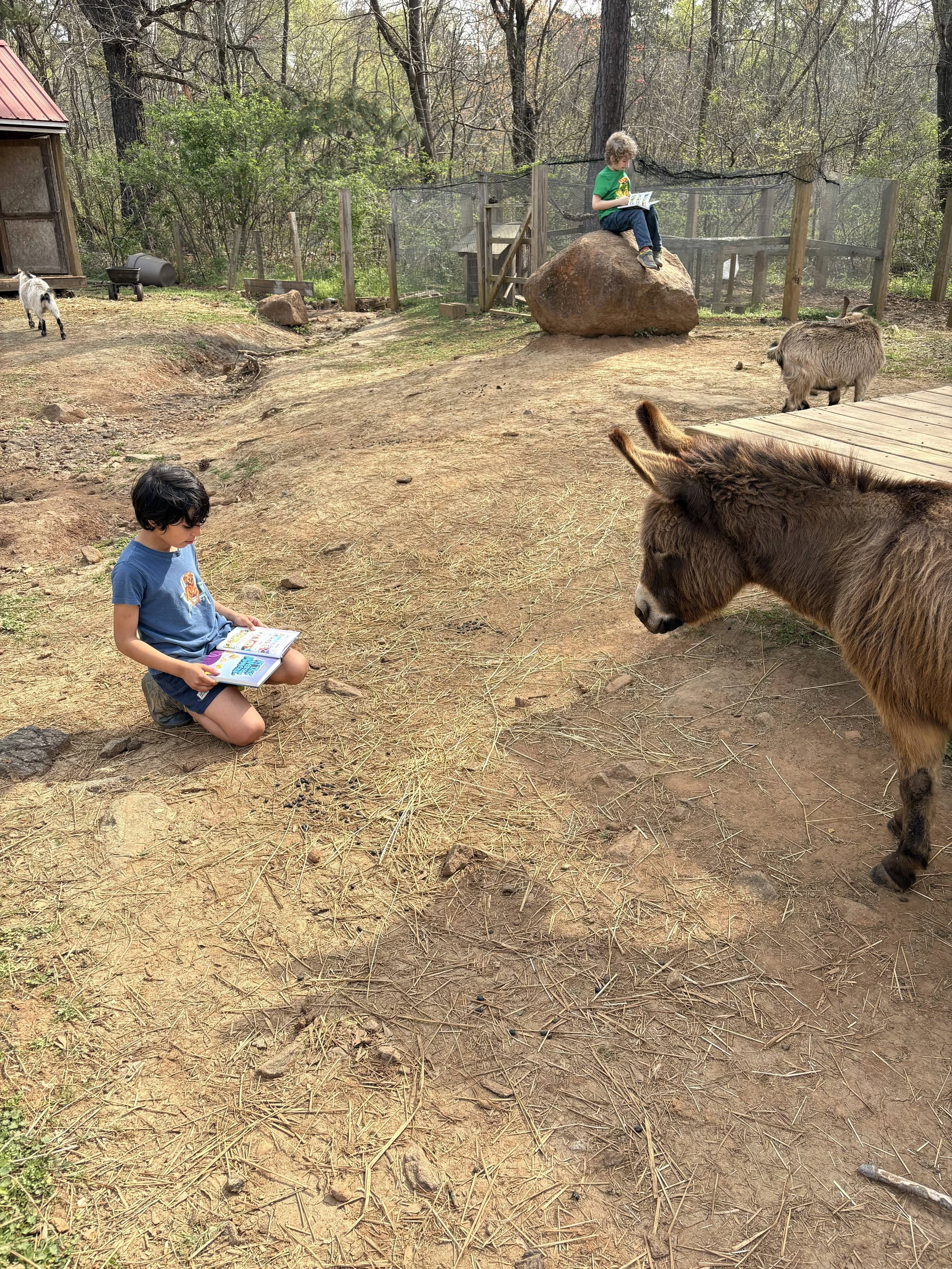 In addition to the regular curriculum, the class took a special trip to the farm to practice their reading skills. Each student brought a book of their choice and read aloud to an animal. The goats and chickens proved to be excellent listeners, while the donkeys were a bit more easily distracted. The students enjoyed reading to a judgment-free audience, and this activity helped build their confidence in reading aloud. At home, reading aloud to pets or stuffed animals can provide similar support and encouragement. Locally, we also have Charlie and Beau the Reading Dogs available at Sequoyah Regional Libraries on select Saturdays to “listen” to children read in a stress free environment.