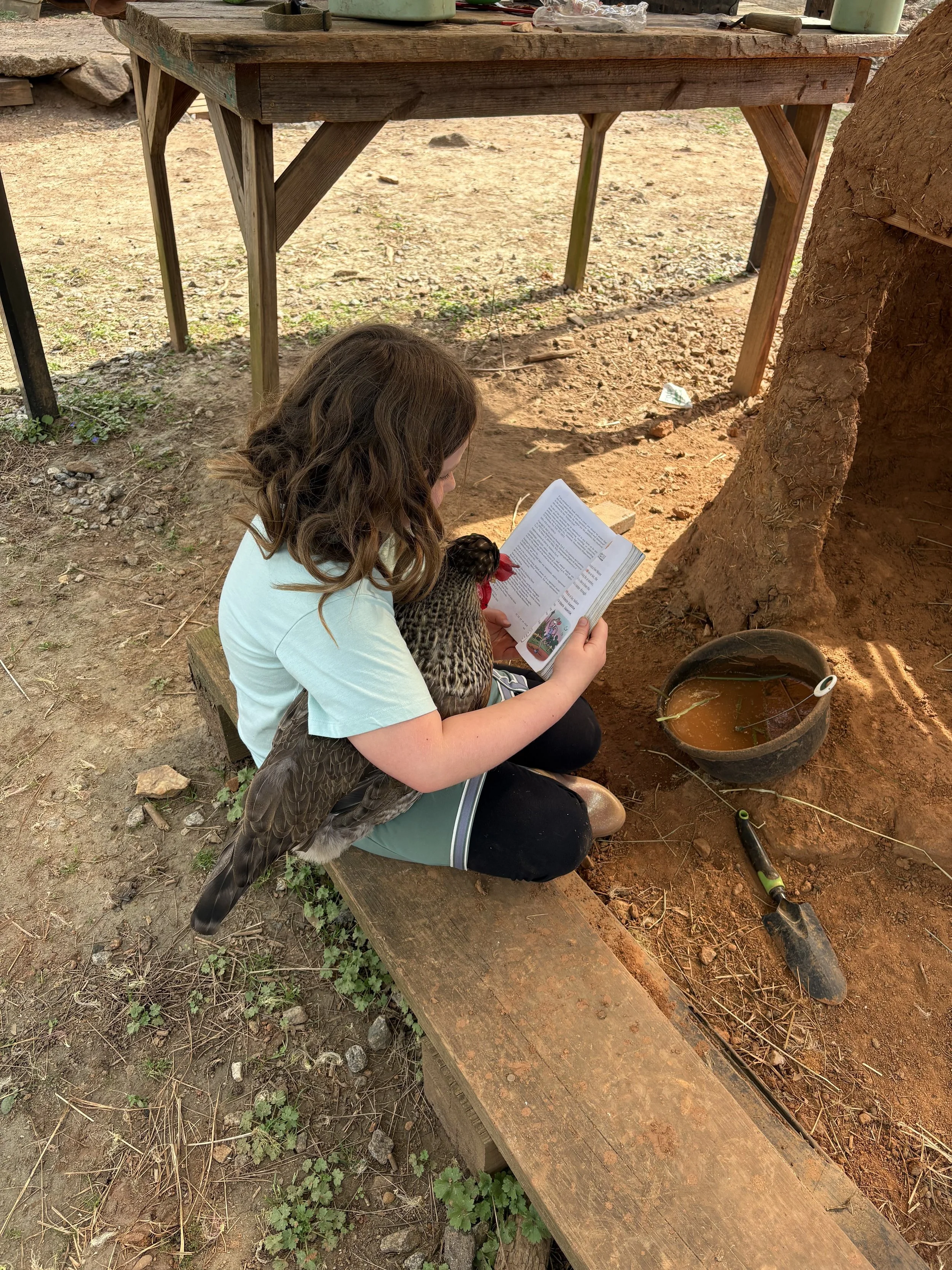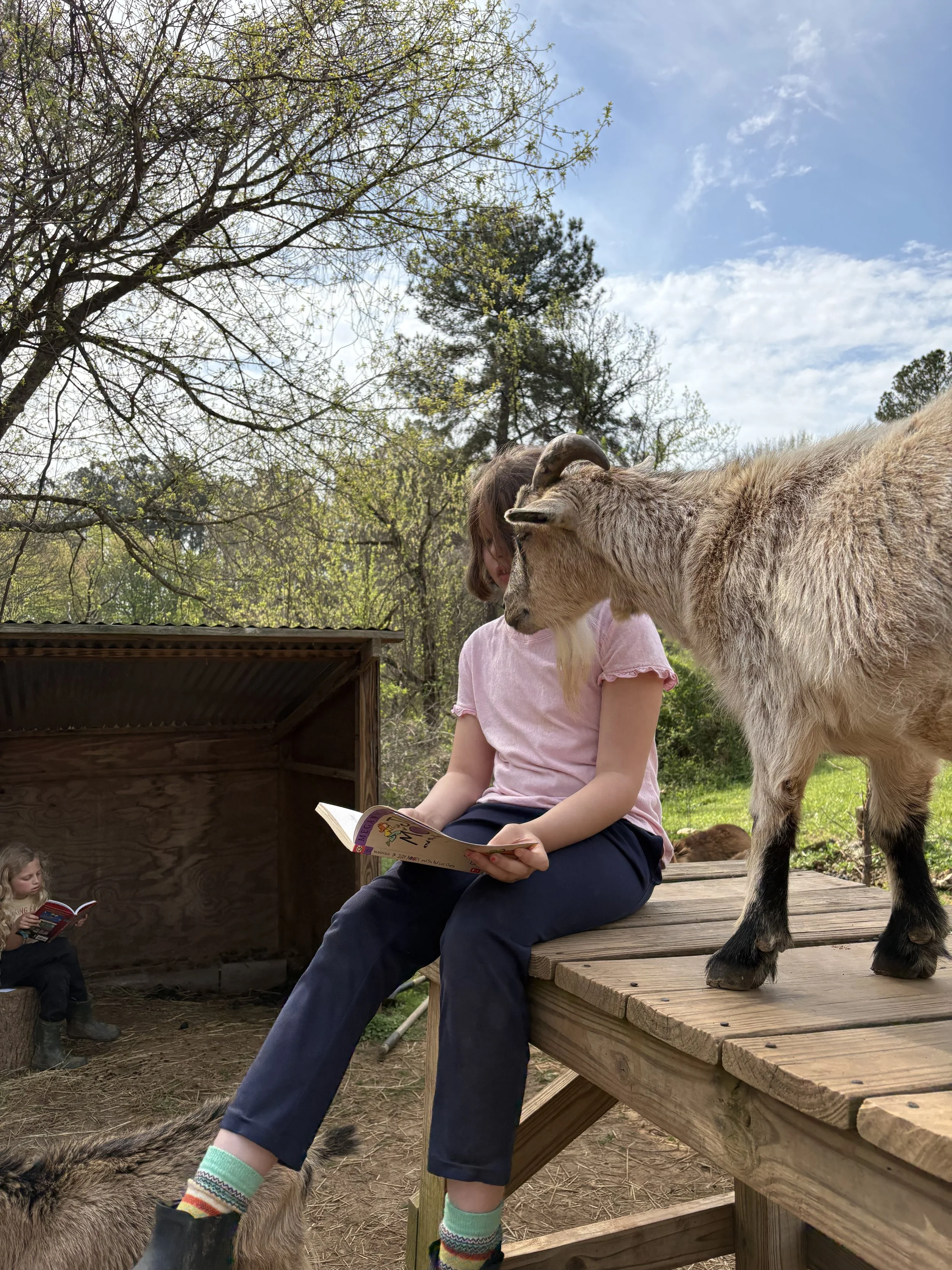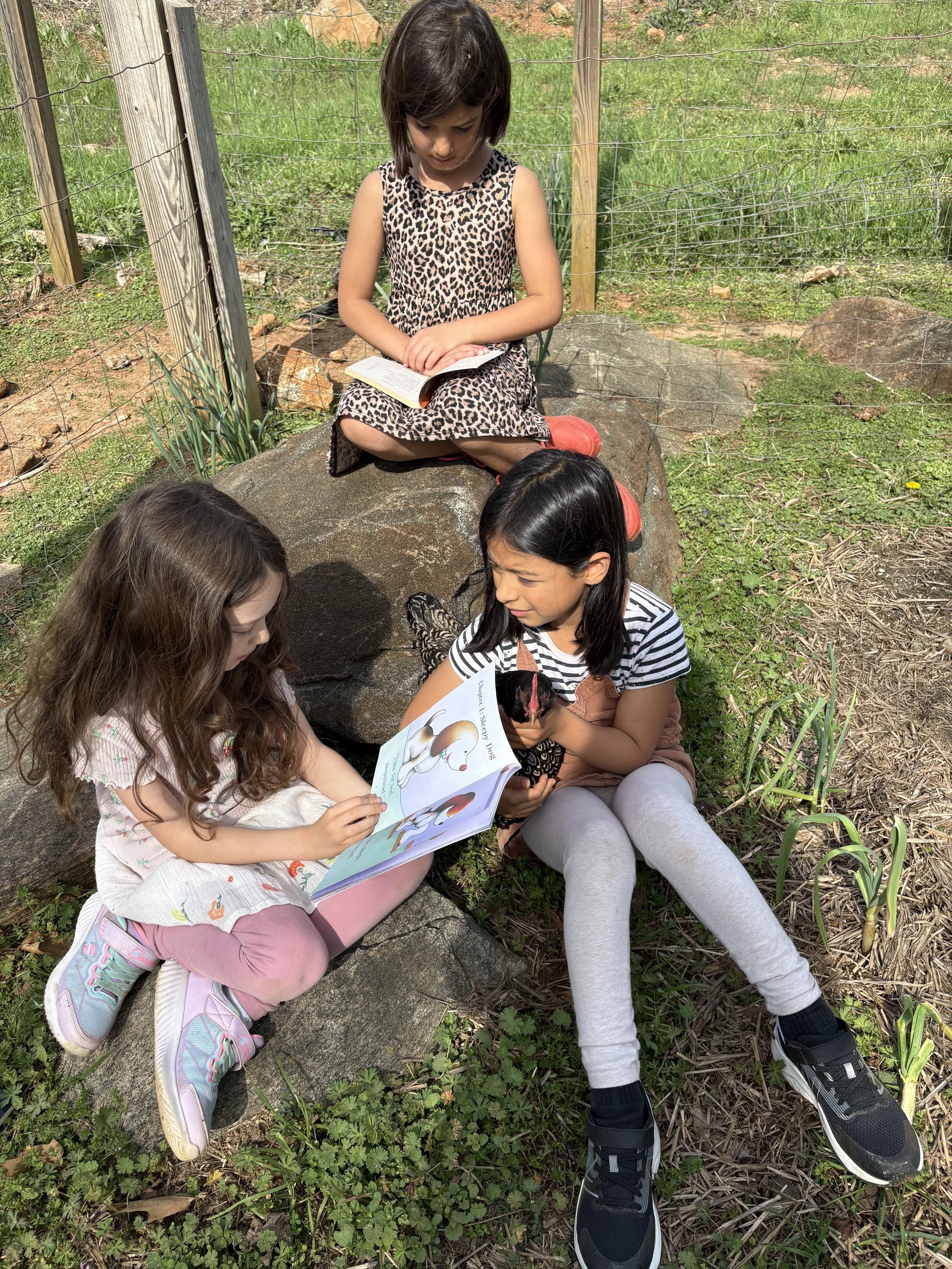 In addition to the regular curriculum, the class took a special trip to the farm to practice their reading skills. Each student brought a book of their choice and read aloud to an animal. The goats and chickens proved to be excellent listeners, while the donkeys were a bit more easily distracted. The students enjoyed reading to a judgment-free audience, and this activity helped build their confidence in reading aloud. At home, reading aloud to pets or stuffed animals can provide similar support and encouragement. Locally, we also have Charlie and Beau the Reading Dogs available at Sequoyah Regional Libraries on select Saturdays to “listen” to children read in a stress free environment.