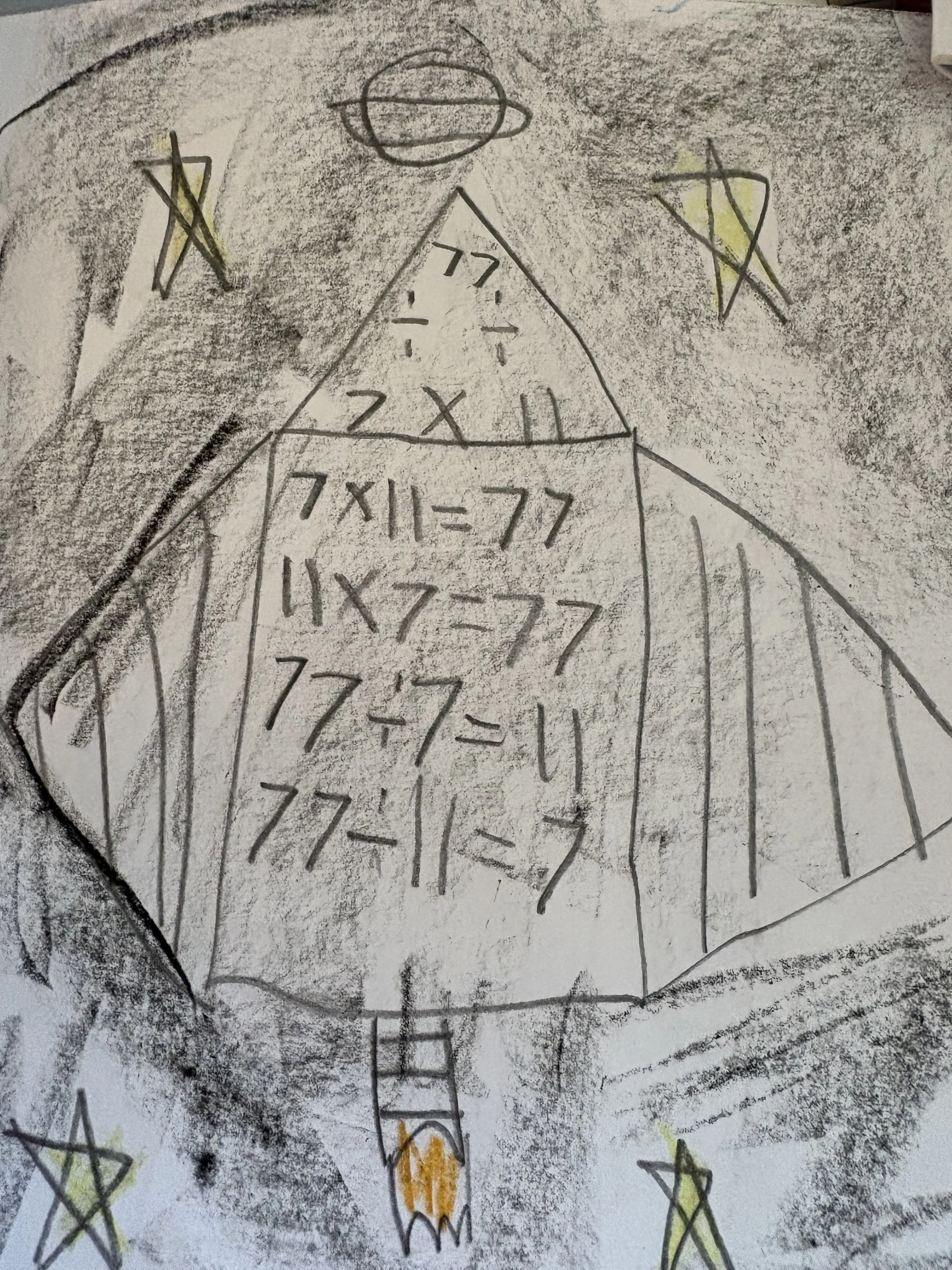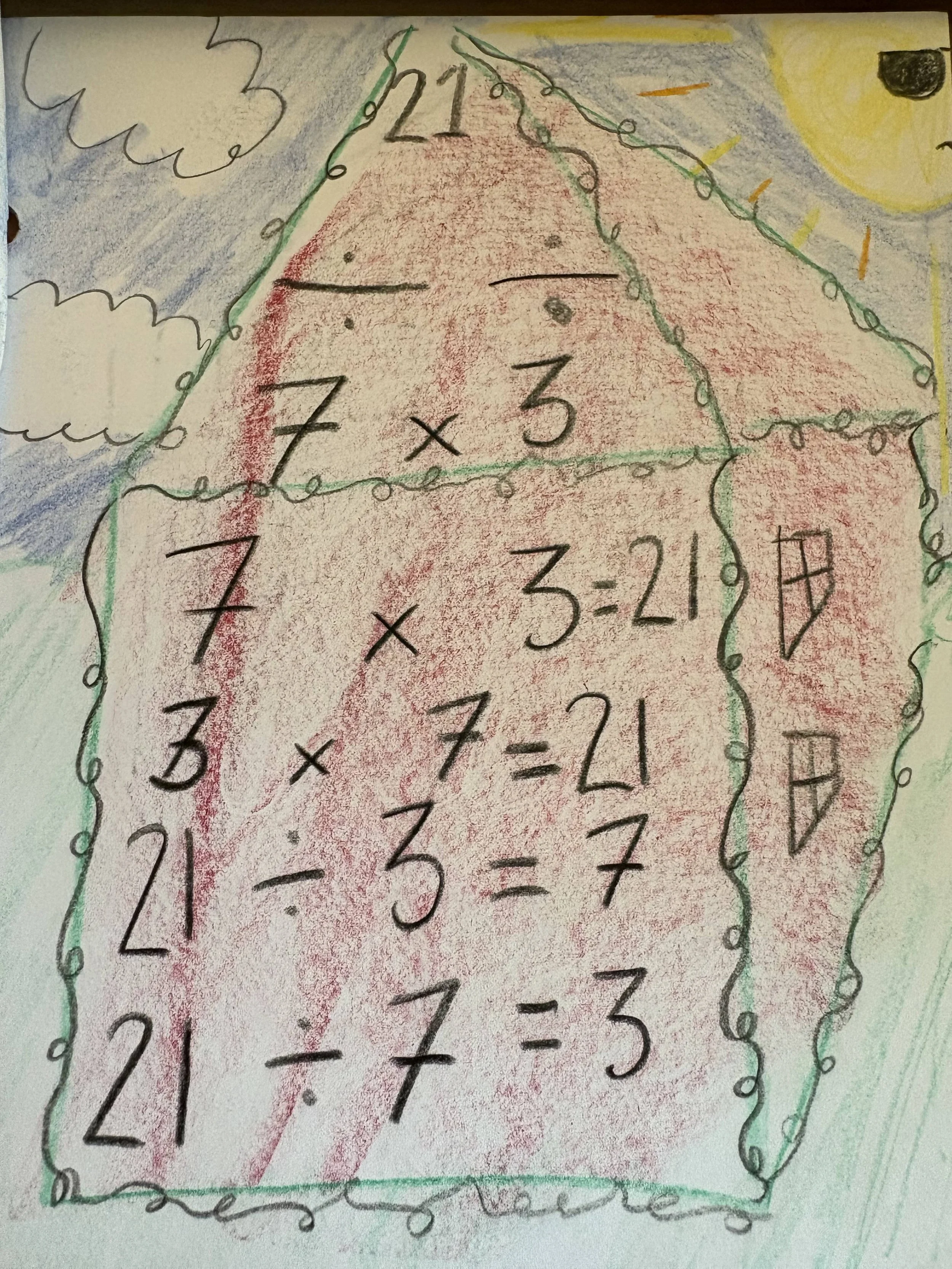 The class reviewed division skills by revisiting fact families. While many students have memorized the multiplication tables from 1–12 and can confidently solve one-digit multiplication problems, several needed additional practice with division. To strengthen their understanding of the relationship between multiplication and division, each student solved 12 multiplication problems and then used their answers to create fact families. As an example, after solving 9 × 5 = 45, students drew a “fact family house,” placing 45 at the top and 9 and 5 at the bottom. Using these numbers, they wrote four related equations: 9 × 5 = 45, 5 × 9 = 45, 45 ÷ 9 = 5, and 45 ÷ 5 = 9. This activity helped them clearly see how multiplication and division are connected and how they can apply their multiplication knowledge to solve division problems. Students then created fact family books, designing houses filled with different related equations. This allowed them to combine creativity with math practice. Many even shared that division was becoming fun.