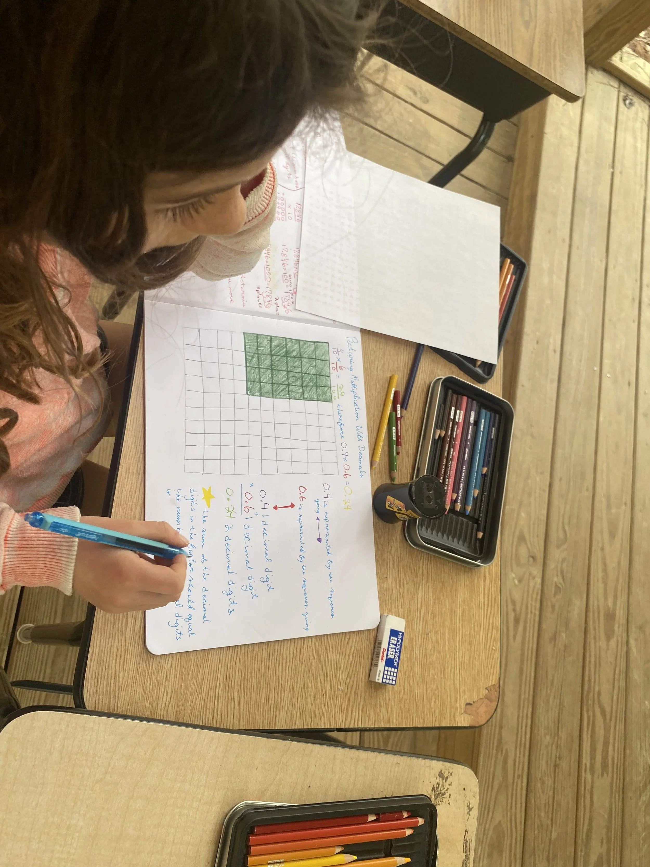The class is continuing their studies in the Decimal Fractions block. The focus for this week was multiplying decimals by decimals and understanding where to place the decimal point in the product. The students received an ample amount of practice in their understanding of multiplying decimals through various games, relay races, and individual practice. The class also reviewed adding and subtracting decimals. Time was spent reading and listening to word problems that consisted of decimals; the students worked on figuring out the correct mathematical operation and mapped out the problem in order to find the correct answer.