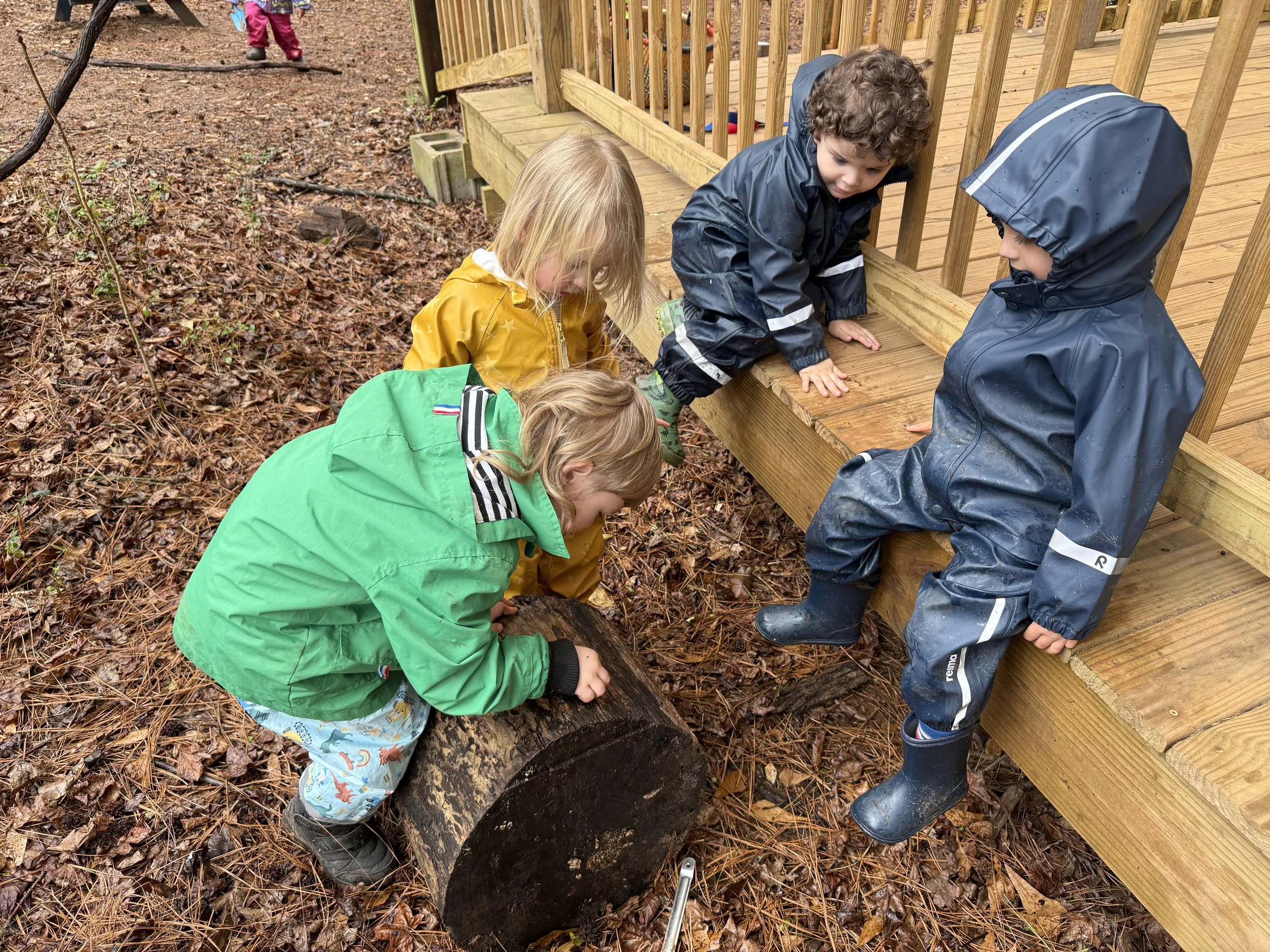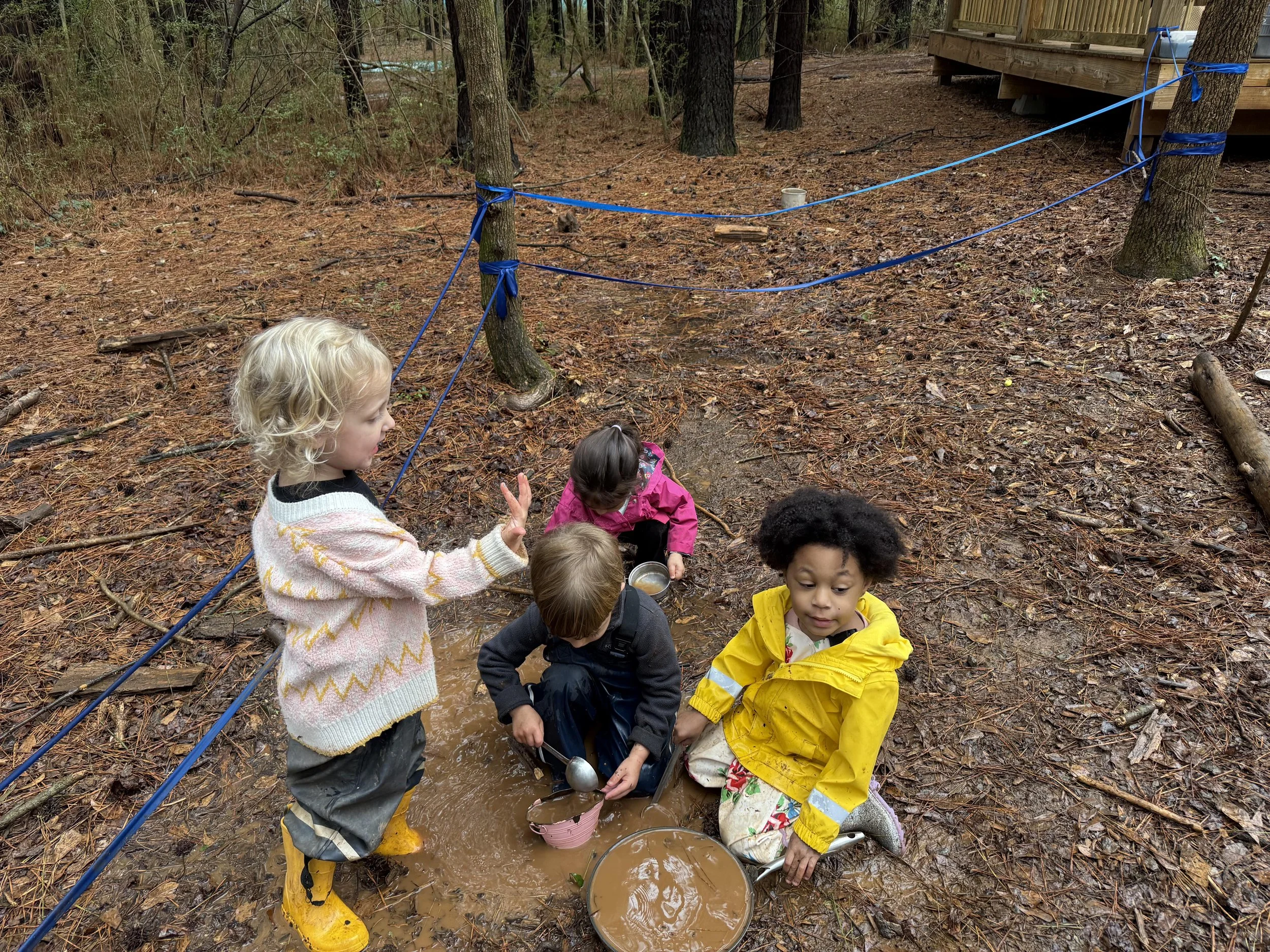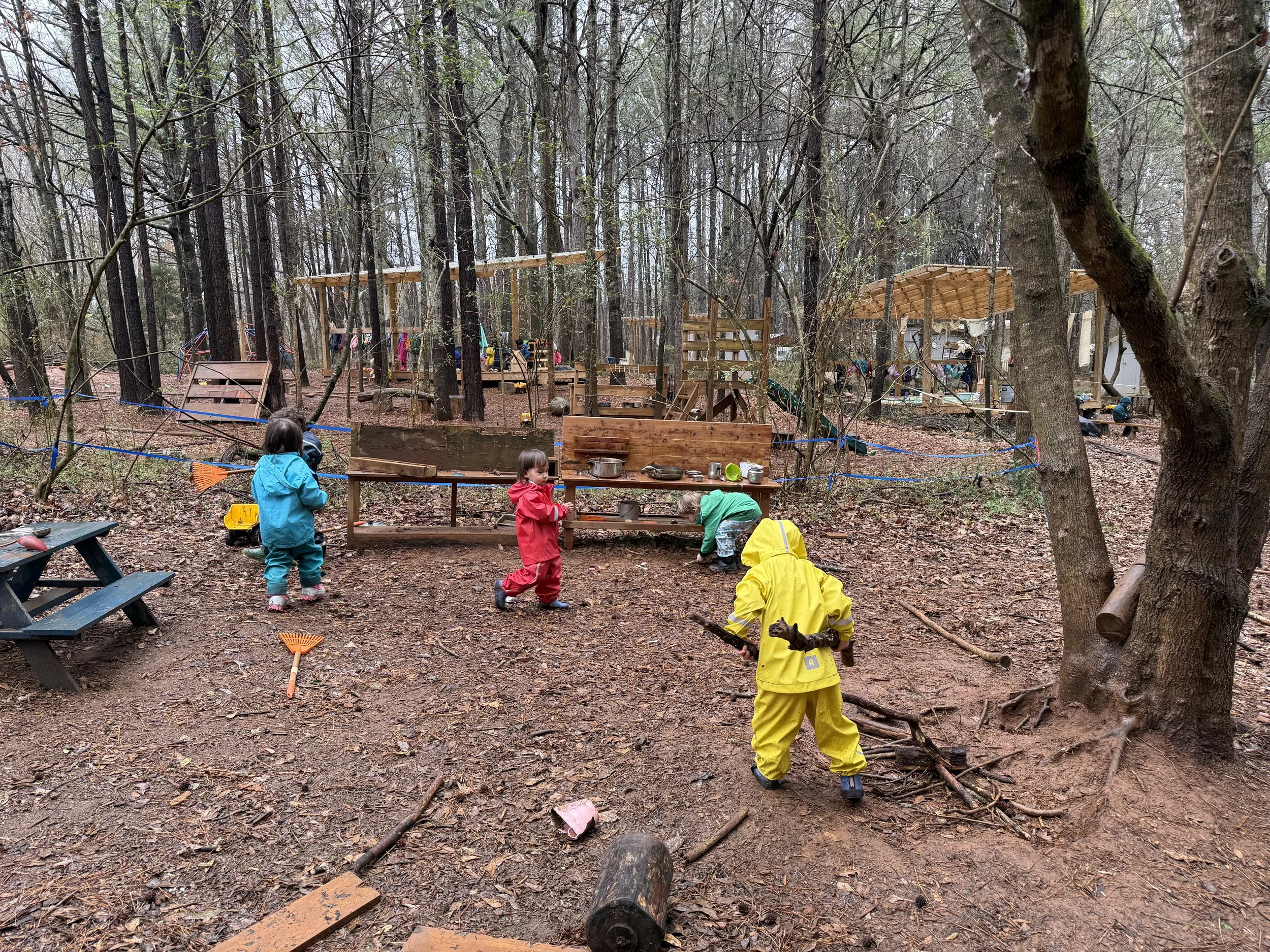 Earlier in the week, discovering pots and buckets of ice in the forest was the highlight of the week. The children eagerly set to work, using shovels and spoons to chip and crack the ice. After the rain fairy visited us, the play naturally shifted to jumping in the puddles, playing with mud, and digging for worms. Our forest environment truly allows the children to experience the change of seasons, deepen their connection to nature, and build resilience along the way.