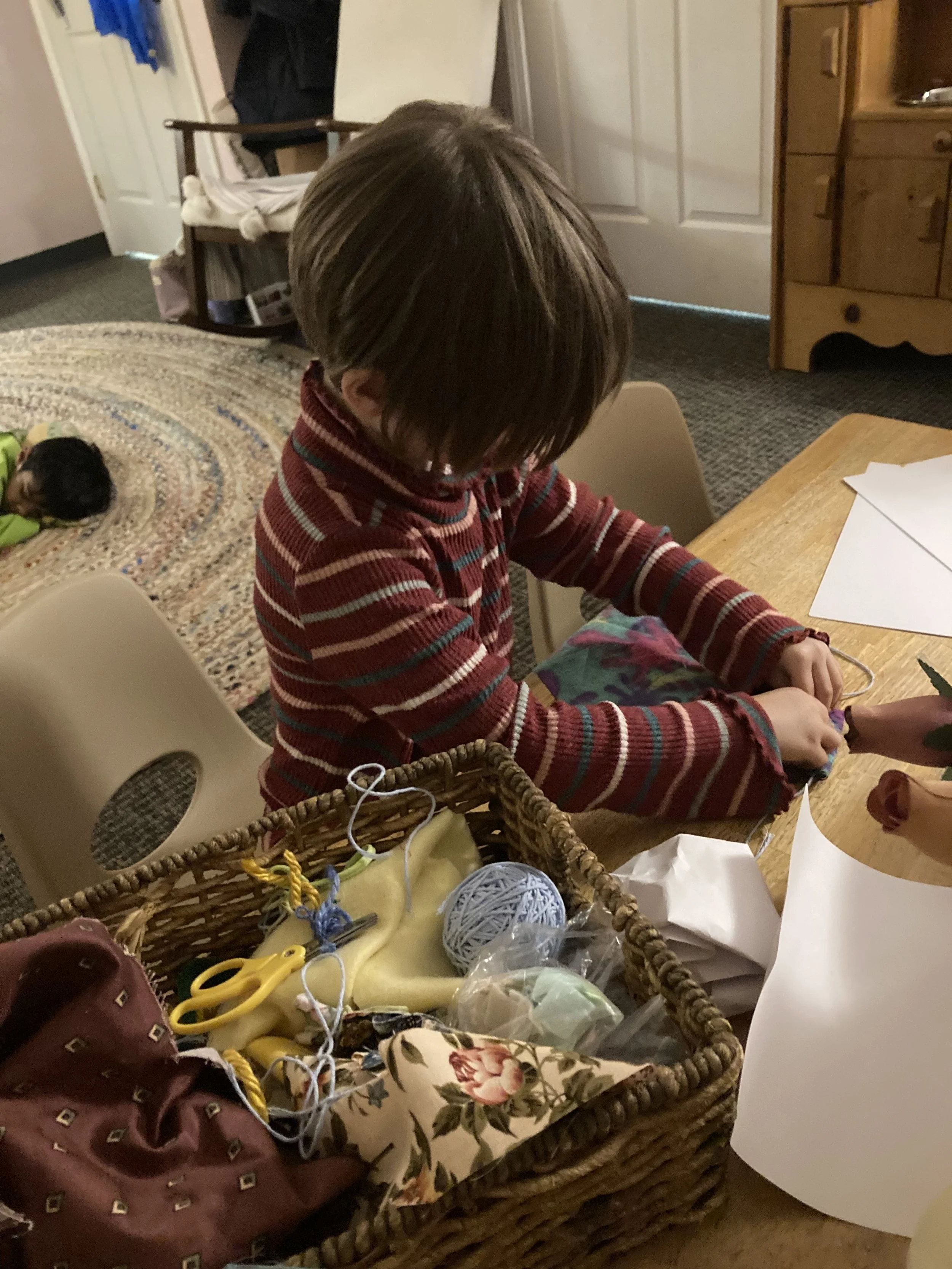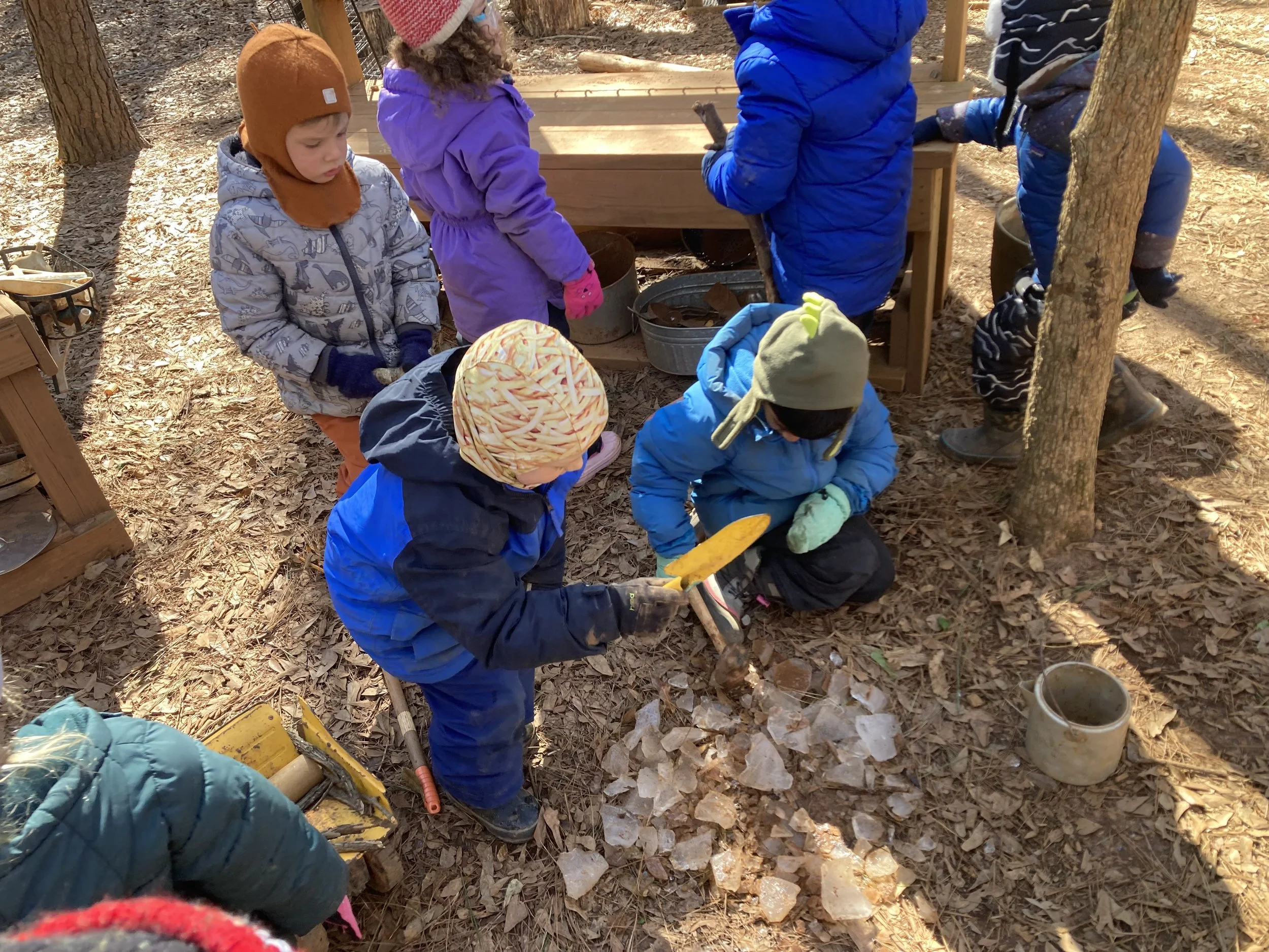 Mother Nature gave the Chickadee class a wonderful experience of all she had to offer last week. The children started the week exploring ice, breaking it with sticks and shovels, scooping it into buckets, and carrying it around the forest classroom. Wednesday was filled with fort building and imaginative play involving baby animals and families. Students were able to enjoy a rainy day on Thursday as they splashed in puddles, collected rain in various vessels, created recipes with mud and pine straw in the mud kitchen, and found many worms. On Friday, students had the opportunity to use the fabric basket to sew or otherwise create their own handicrafts.