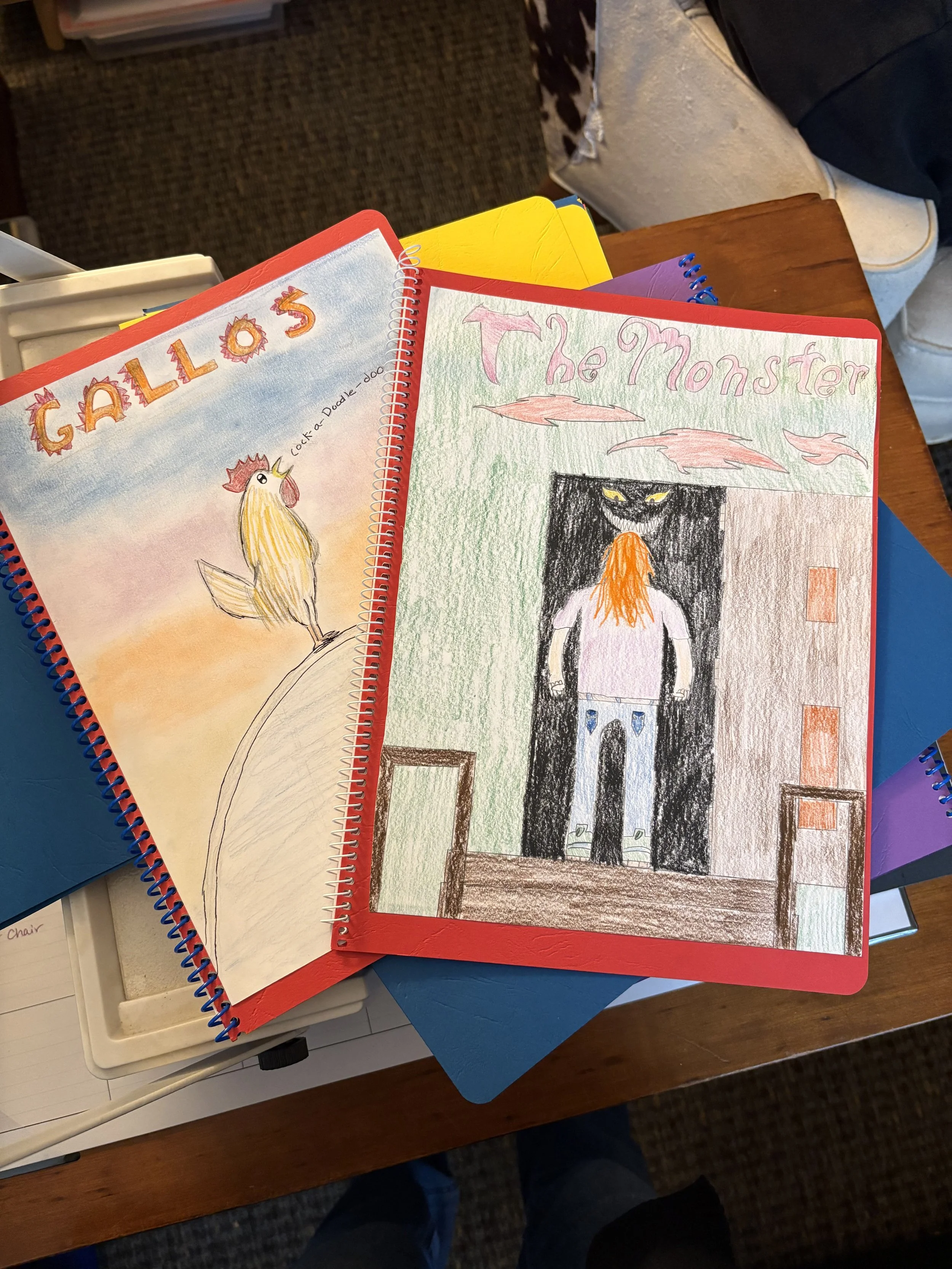 After displaying their hand-drawn covers in our classroom for a few weeks, each student chose a cover and bound their authored short story. We have a basket of stories in the classroom now for our students to read each other's work. They are all incredibly proud of their stories and are so excited to share them with each other.