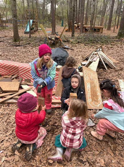 Our classroom was still very wet after last week’s heavy rains, so the class enjoyed plenty of muddy play. Rain gear was required—even on dry days—since our space stays wet for quite a while after a storm. Students mixed red clay from the digging spot with water to create just the right muddy consistency. The children layered pine straw and mud into small woven baskets, carefully spreading the mud thinly and covering each layer with pine straw. Once they shaped a nice bowl, the creations were left in the sun to dry. Next week, after they have time to dry and harden, we will remove the baskets and have mud bowls ready to use. The children will chop apples, add bird seed and grains, and fill the bowls as a treat for the birds and small animals we share our class with.