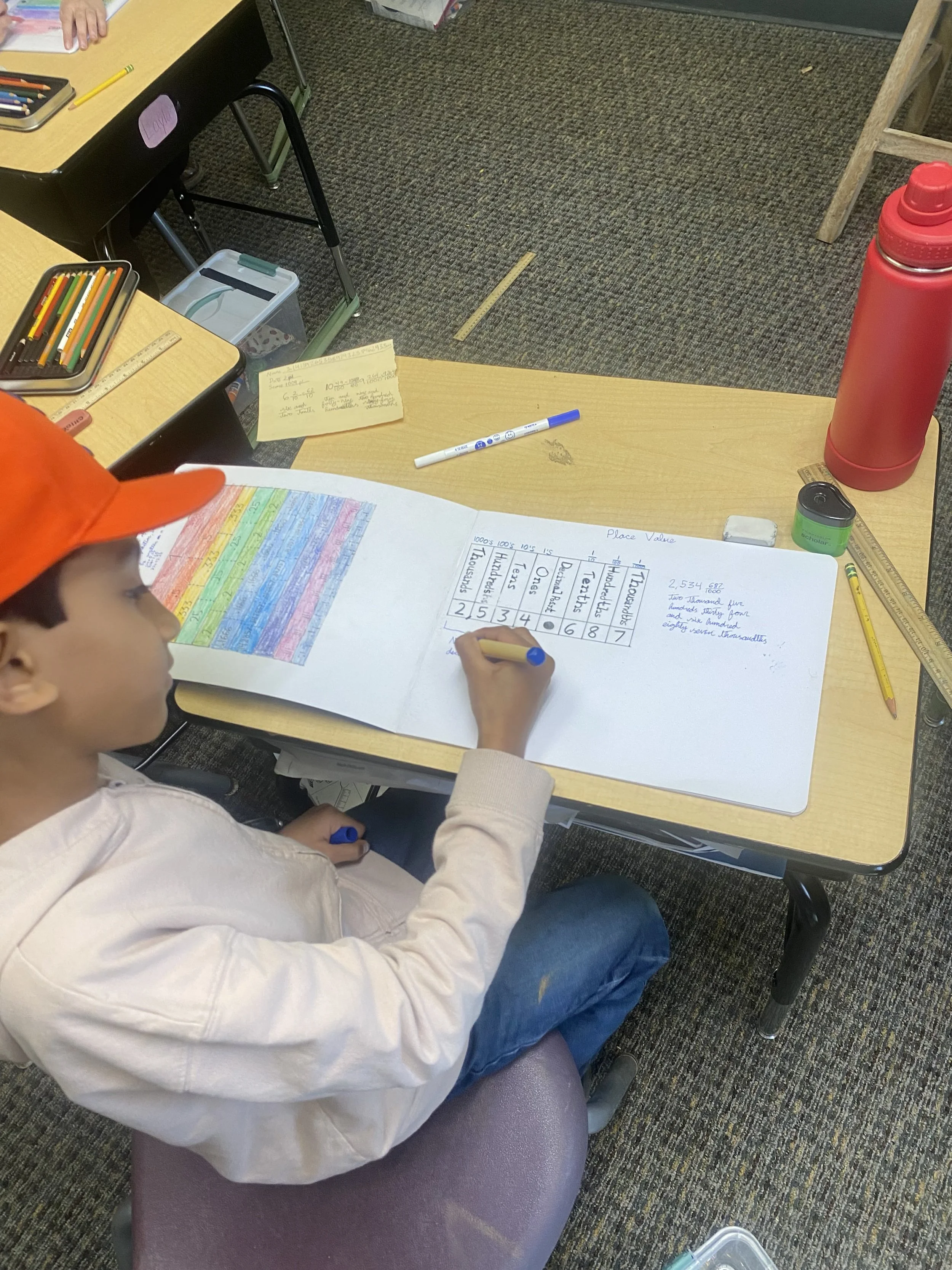 This week, the class began their eighth Main Lesson Block: Decimal Fractions. Building on our fractions from last month’s mathematics topic, we broke down how proper fractions and mixed numbers can be written differently. The students were reintroduced to the usage of place values of whole numbers. Then they learned how proper fractions can also fit into place values by occupying positions in the tenths, hundredths, thousandths place, and so on. The only difference is now that the decimal point is what divides the whole part of a number from the fractional part of one.