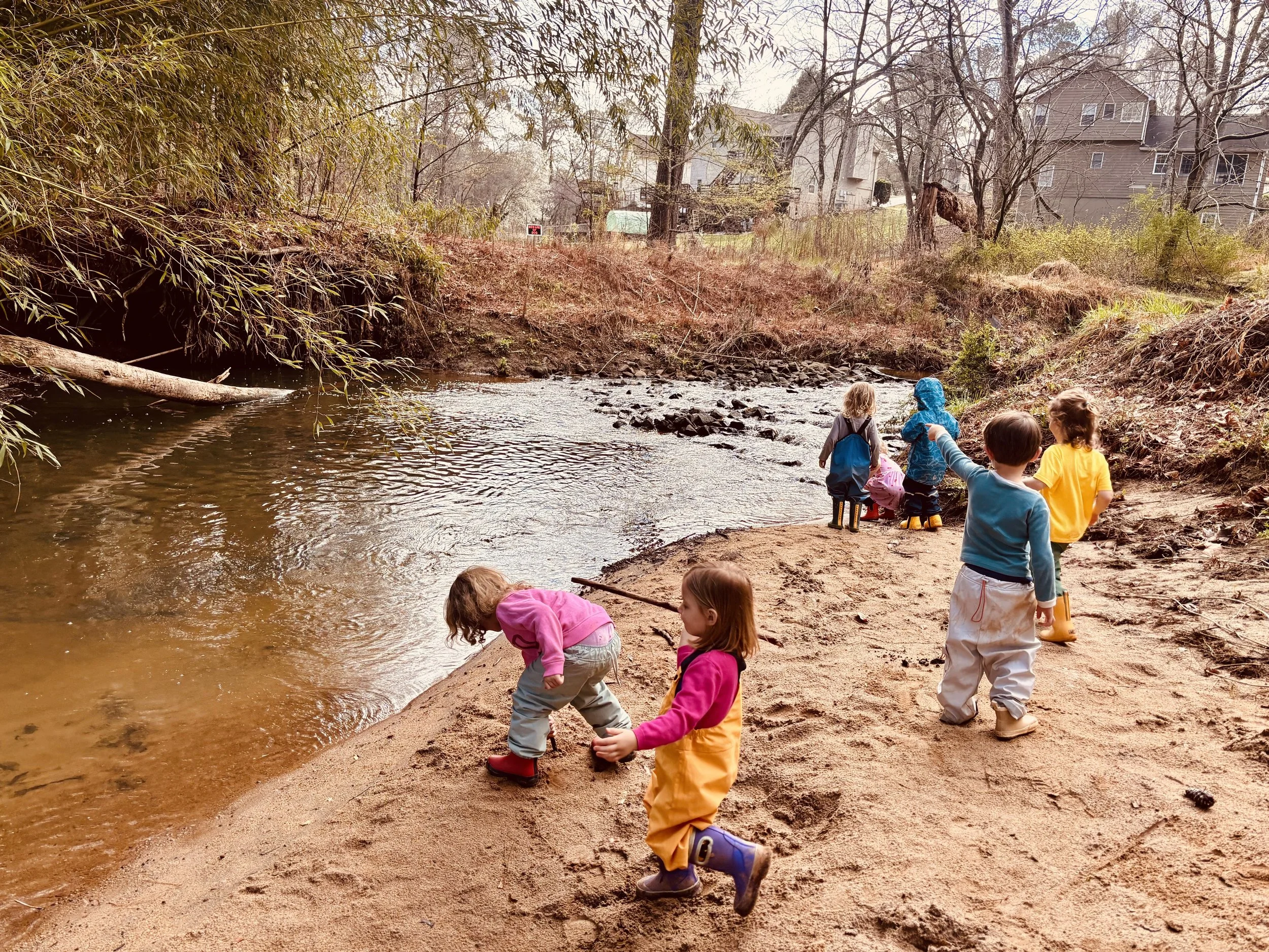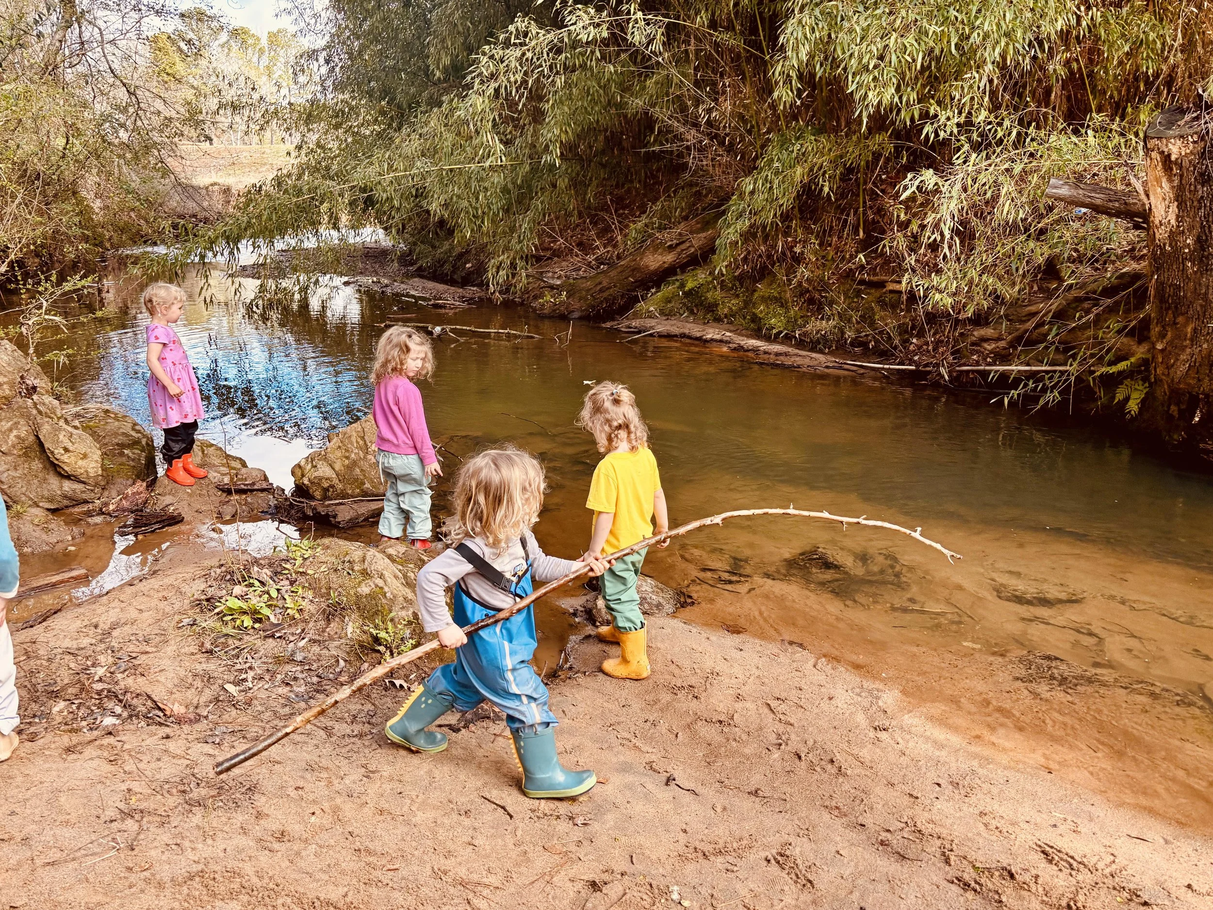 On Monday, as a remedy for a few sleepy eyes after the time change, we took an impromptu walk to the creek beach, where the children experimented with “skipping” rocks and sticks across the water. The children, typically quite content within the cozy boundaries of our Hummingbird nest, were delighted to discover this “hidden” area of campus, a destination that they will frequent when they reach Forest Kindergarten.
