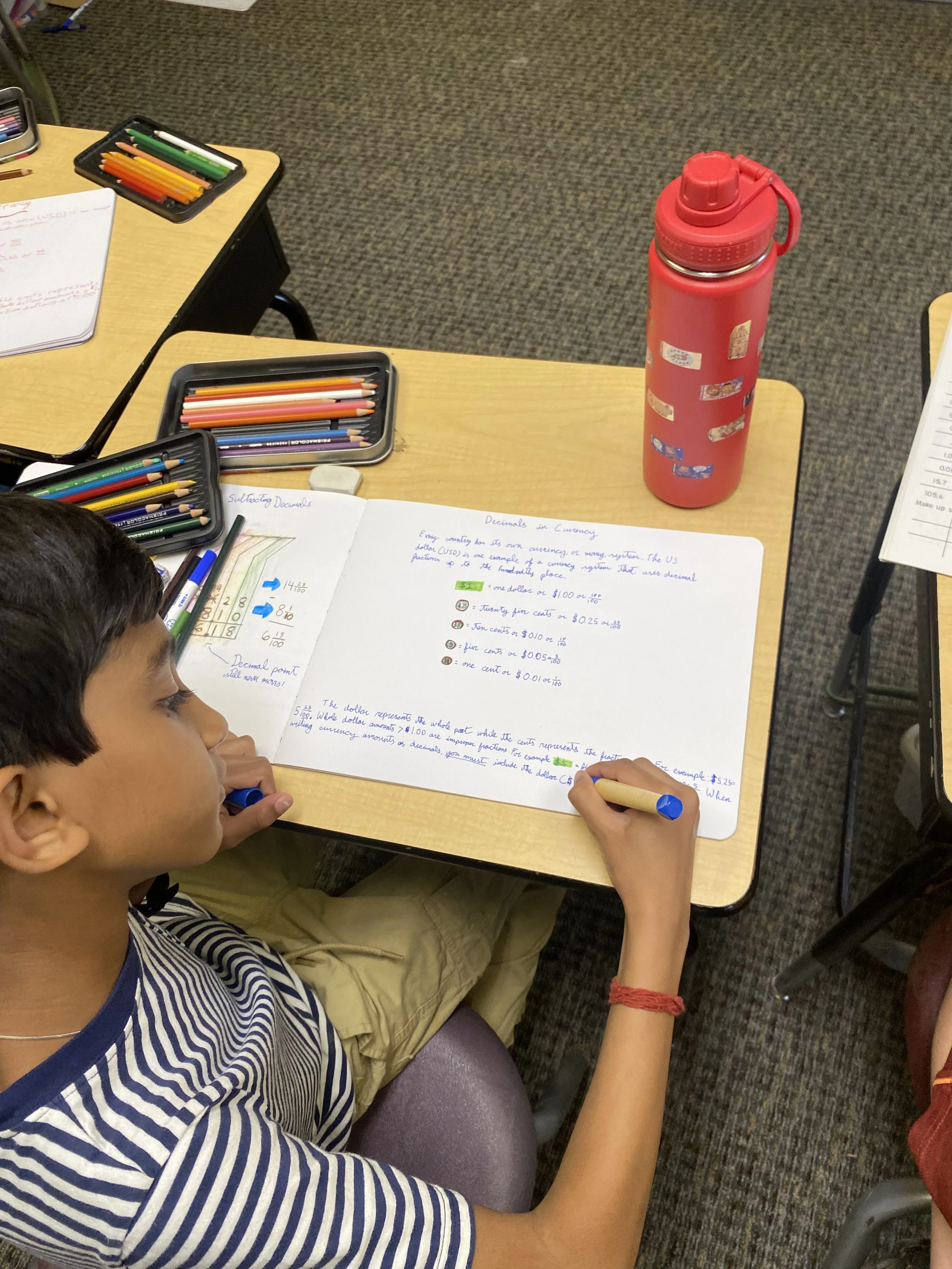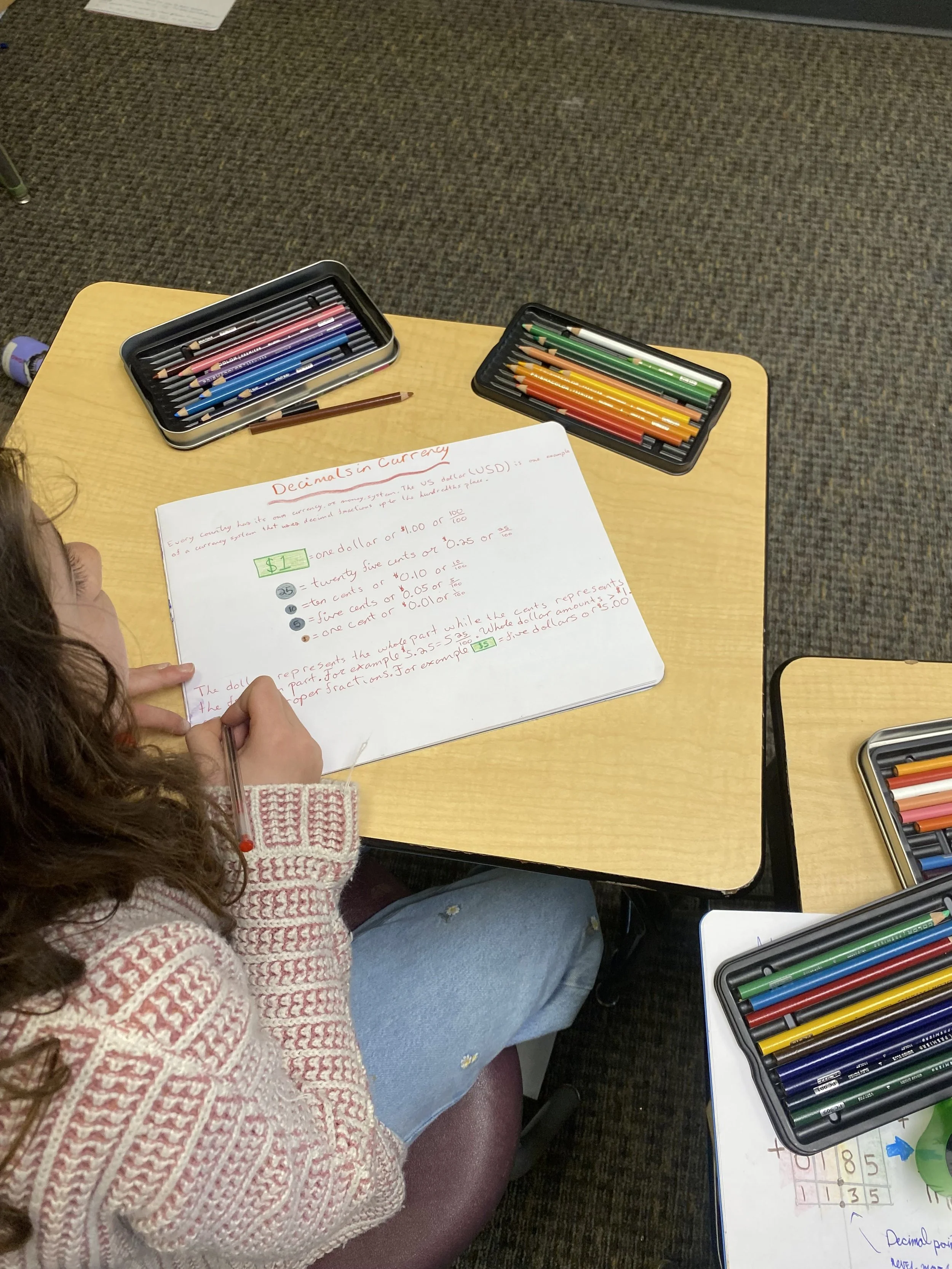 The class is in the second week of Decimal Fractions. Building on the previous week, we worked on adding and subtracting decimals. The concept was initially viewed as rather simple to the majority of the class because it follows many of the same rules they have learned, only now with a decimal point. We continued to work on expanded notation, how decimals are used in our currency as well as currencies from around the world, and learning the most commonly used decimals are ¼ , ½, and ¾ in fraction form.